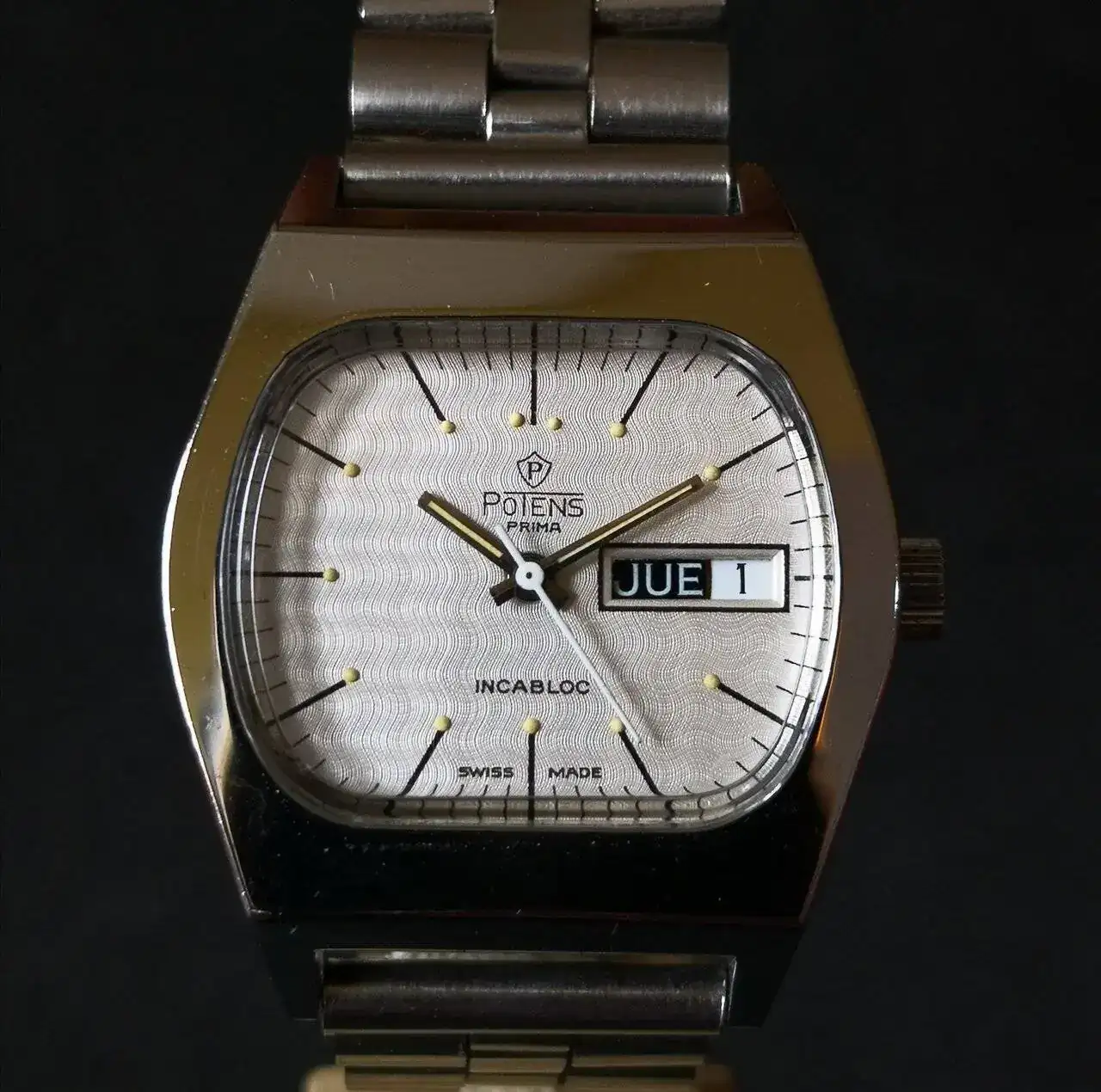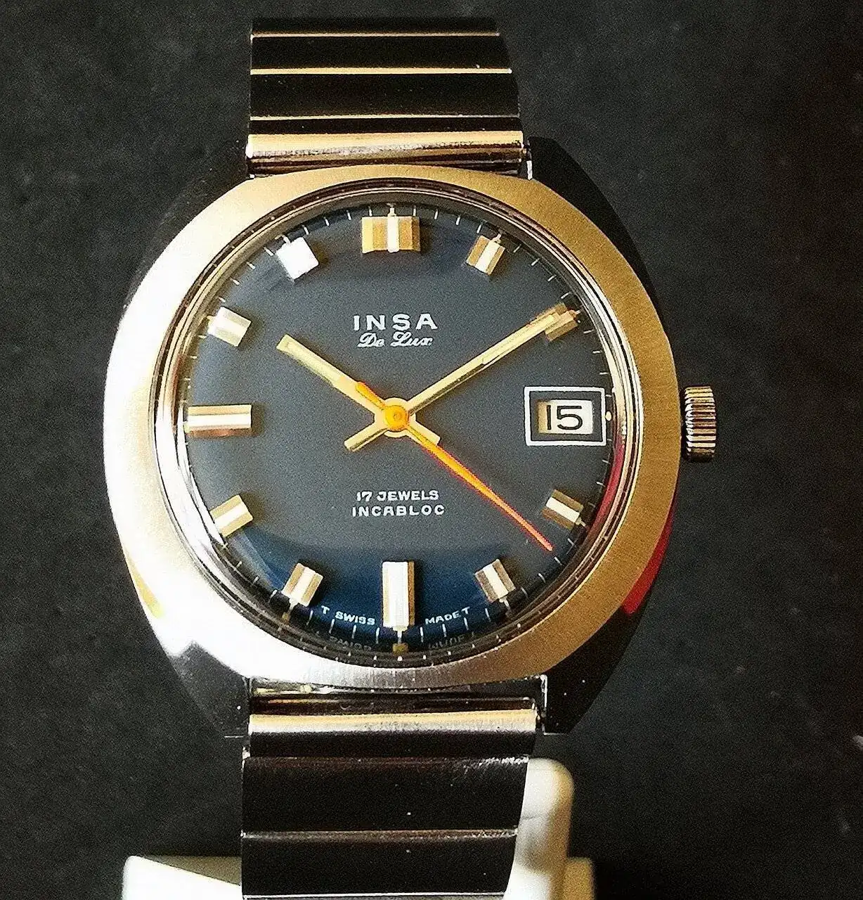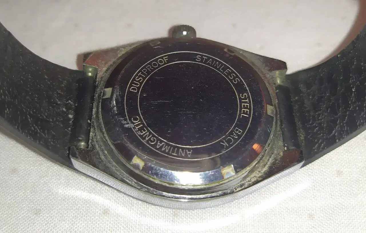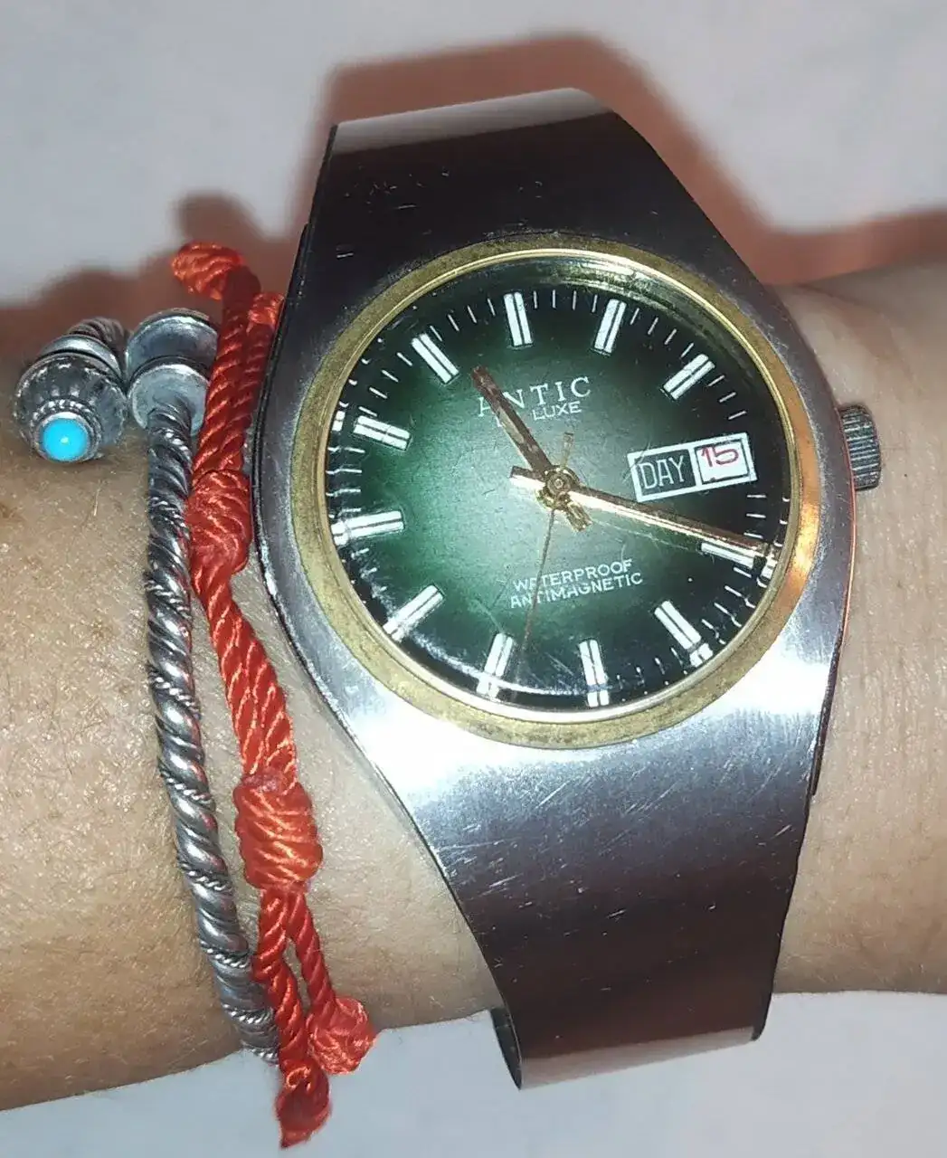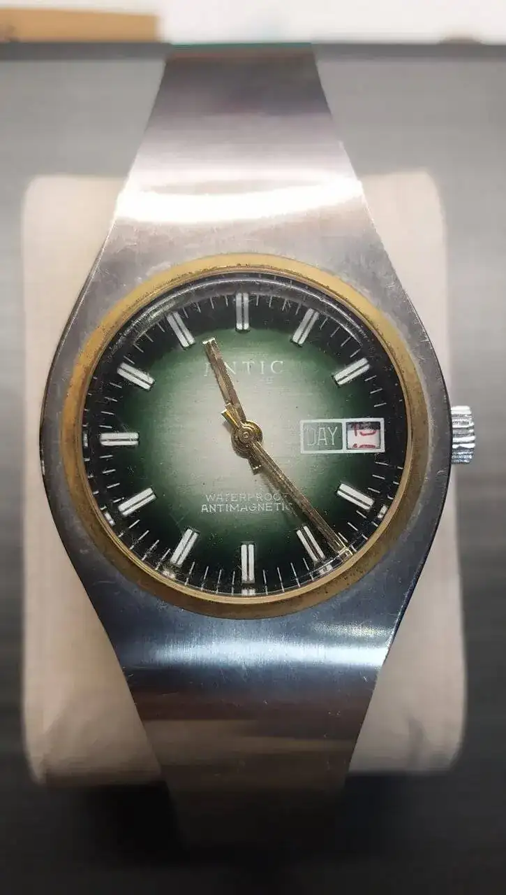 Aquí quizás el más curioso de mi colección. Perteneció también al abuelo de mi marido. Un Antic de luxe (se ve que esta coletilla les daba más caché a los relojes de antes) automático. Lo que hace especial a este modelo es su armis integrado en el reloj. No se puede ajustar ni cambiar. Es como una plancha metálica con un caucho pegado por debajo. Su esfera es de lo más cutre que he visto... Es de esos relojes que de feos que son me gustan y hacen gracia 😂