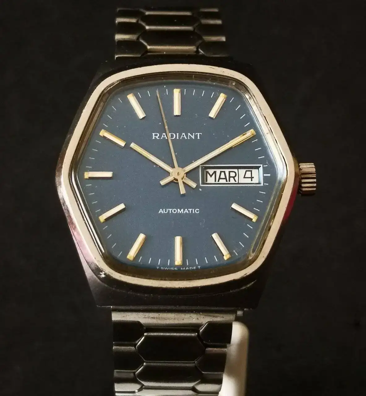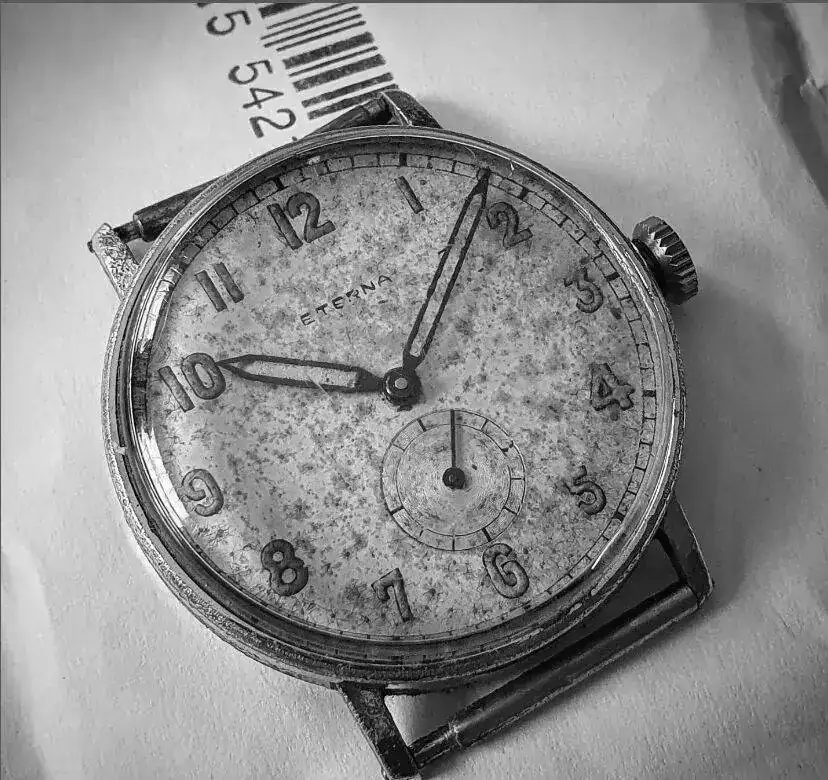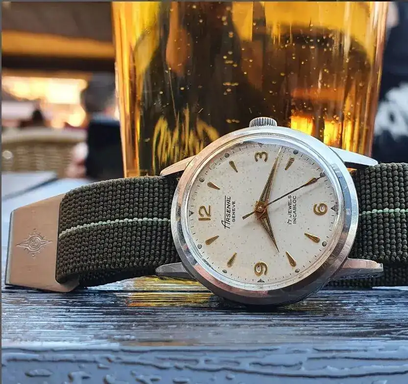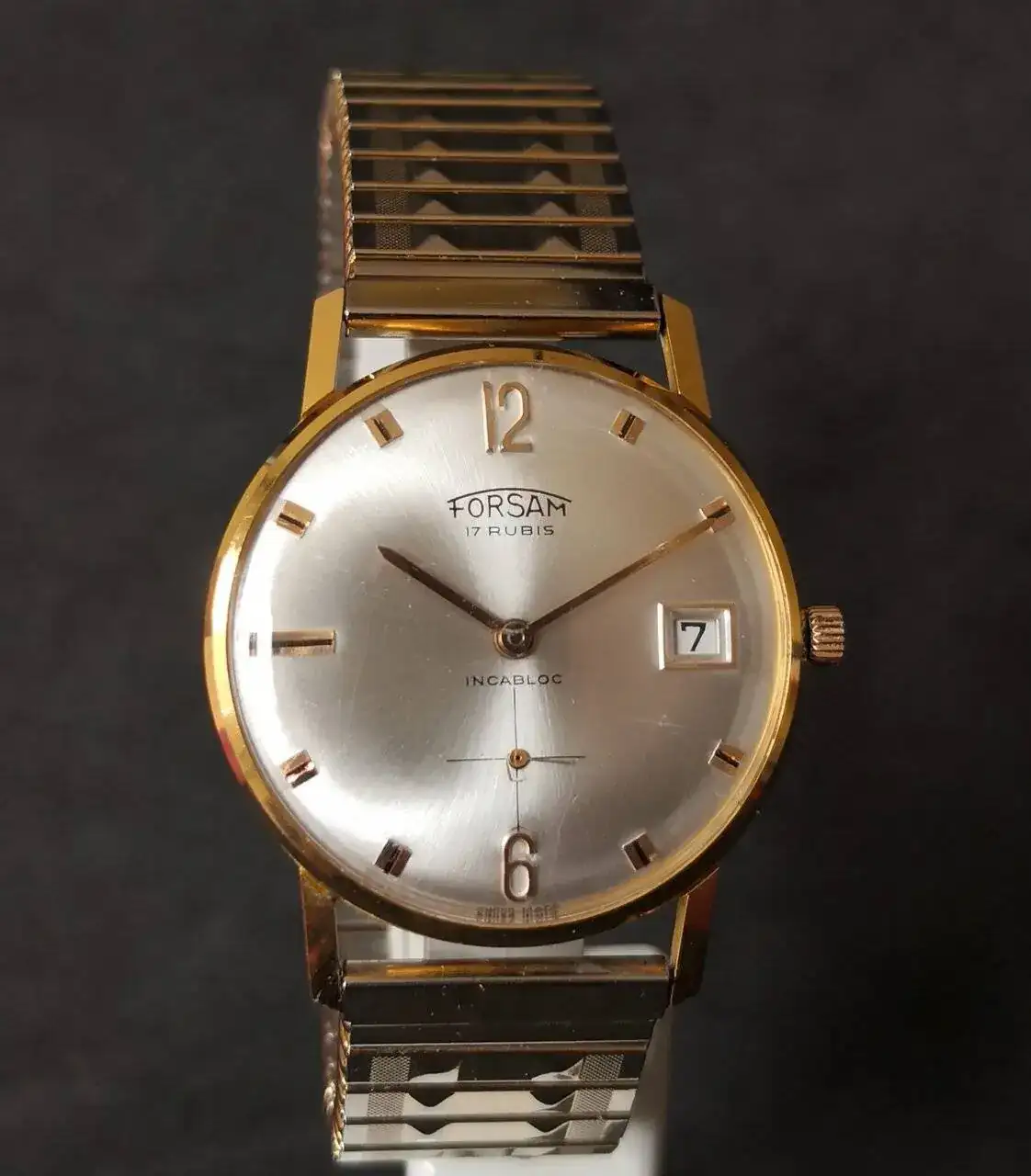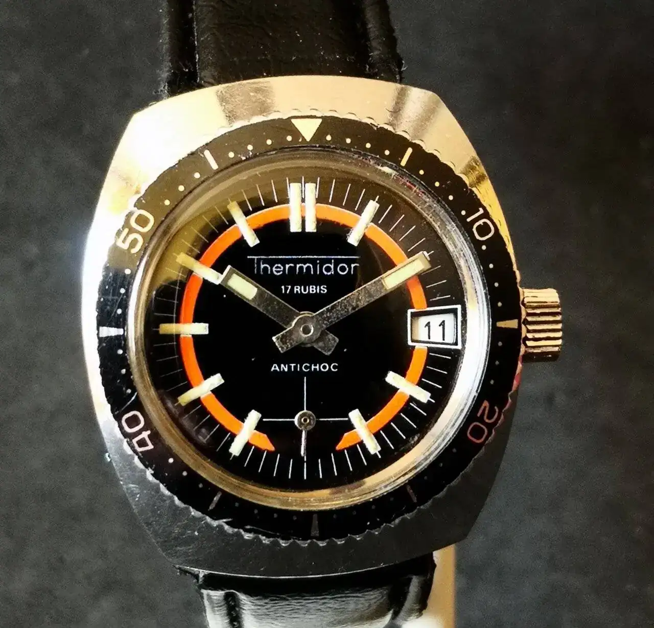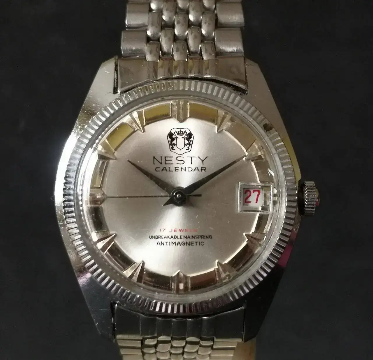 Aquí quizás el más curioso de mi colección. Perteneció también al abuelo de mi marido. Un Antic de luxe (se ve que esta coletilla les daba más caché a los relojes de antes) automático. Lo que hace especial a este modelo es su armis integrado en el reloj. No se puede ajustar ni cambiar. Es como una plancha metálica con un caucho pegado por debajo. Su esfera es de lo más cutre que he visto... Es de esos relojes que de feos que son me gustan y hacen gracia 😂