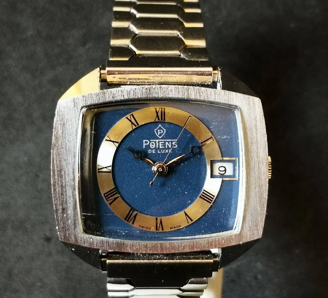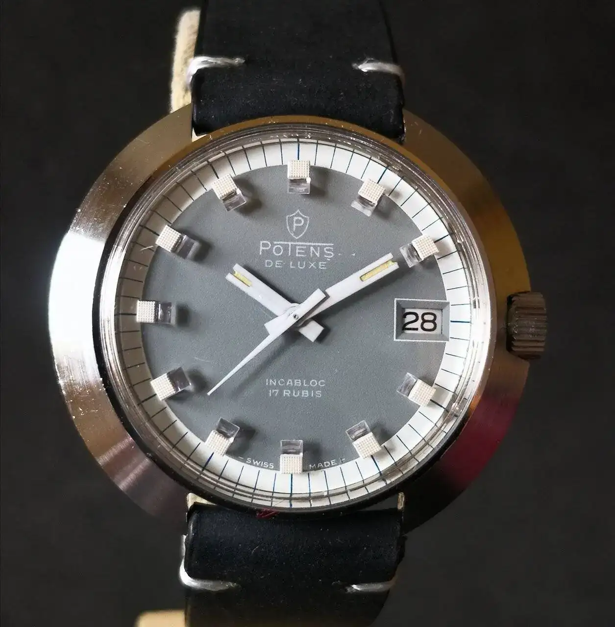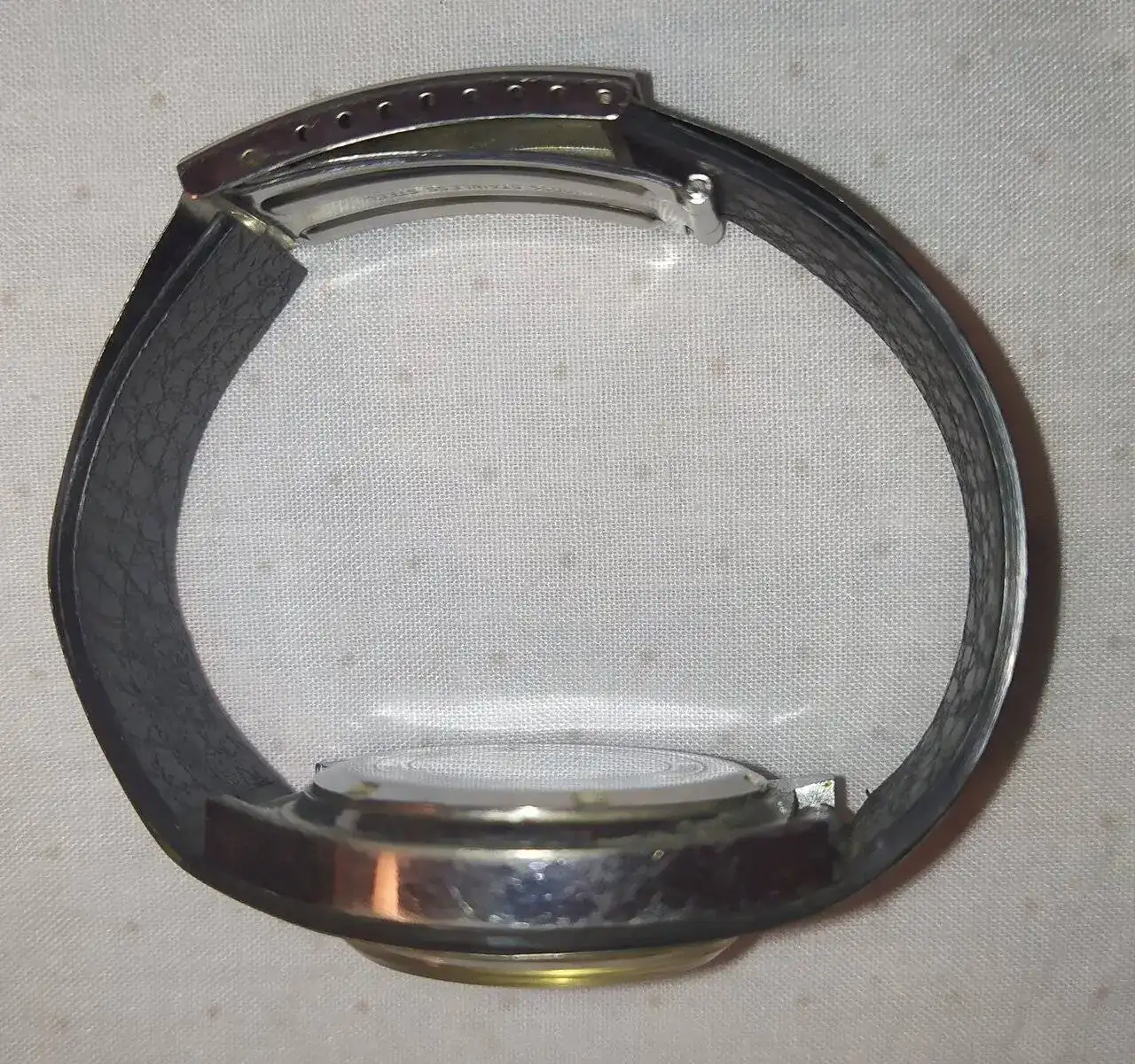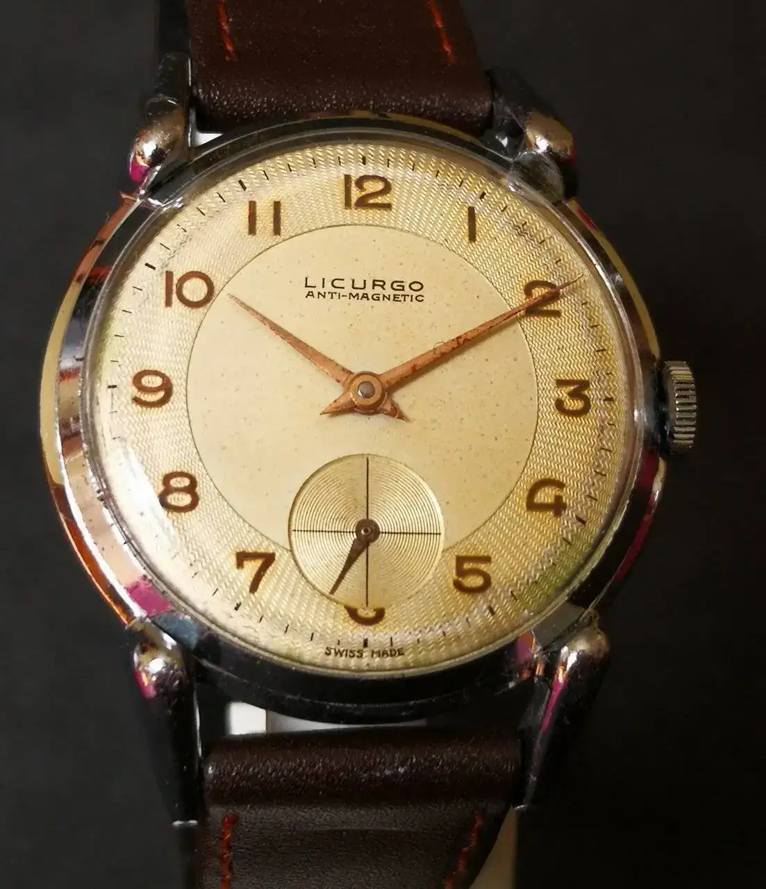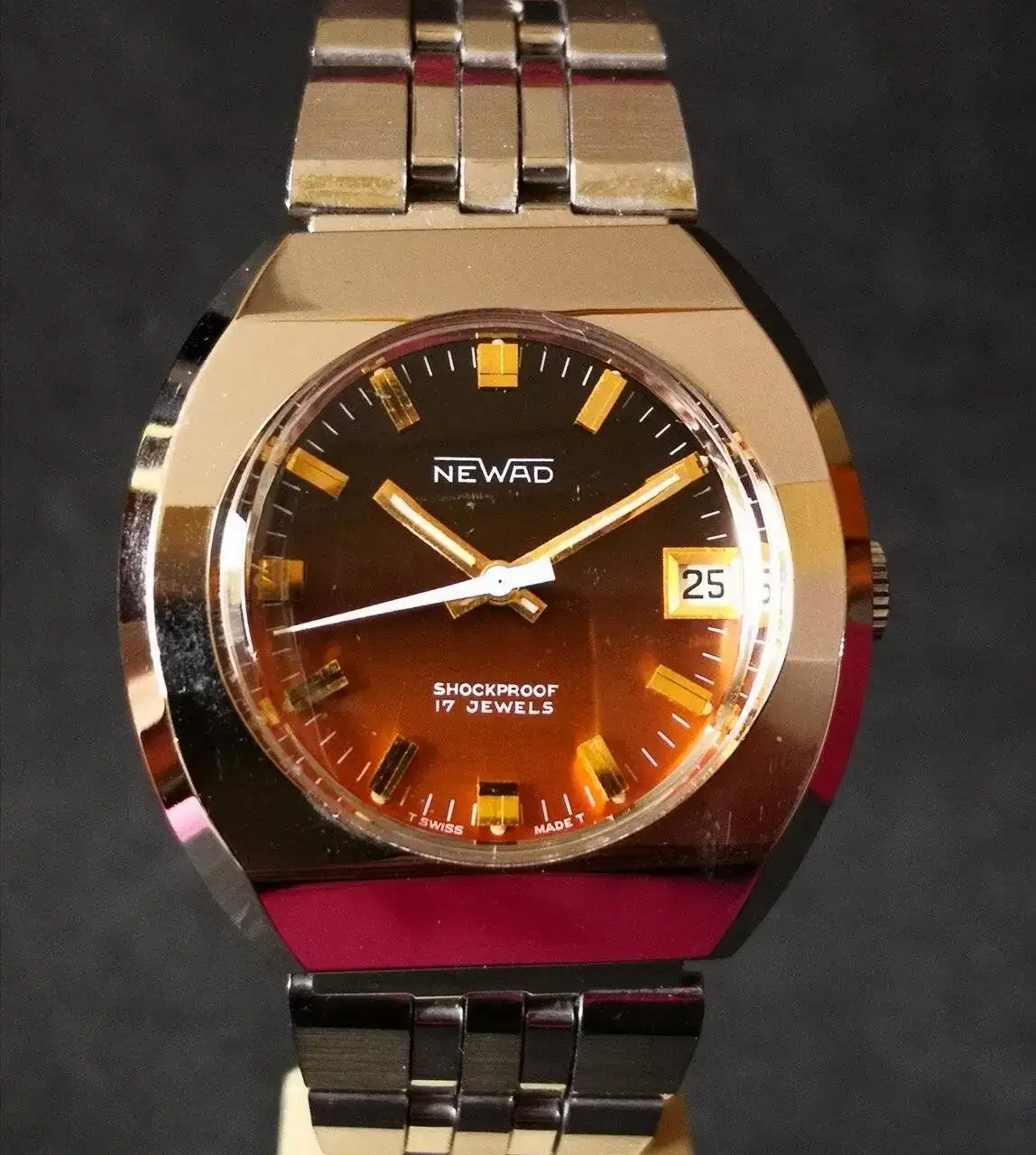 Aquí quizás el más curioso de mi colección. Perteneció también al abuelo de mi marido. Un Antic de luxe (se ve que esta coletilla les daba más caché a los relojes de antes) automático. Lo que hace especial a este modelo es su armis integrado en el reloj. No se puede ajustar ni cambiar. Es como una plancha metálica con un caucho pegado por debajo. Su esfera es de lo más cutre que he visto... Es de esos relojes que de feos que son me gustan y hacen gracia 😂