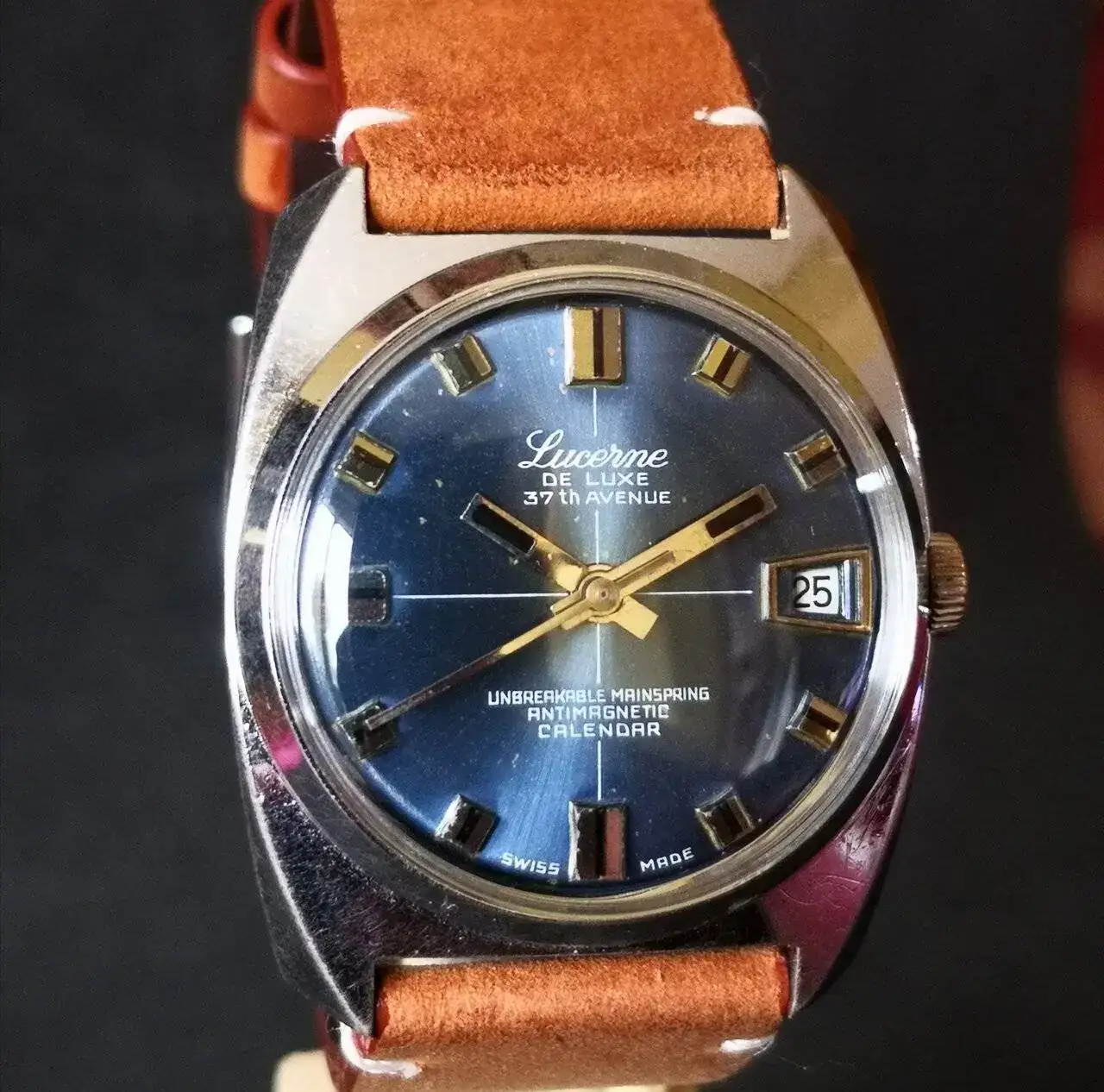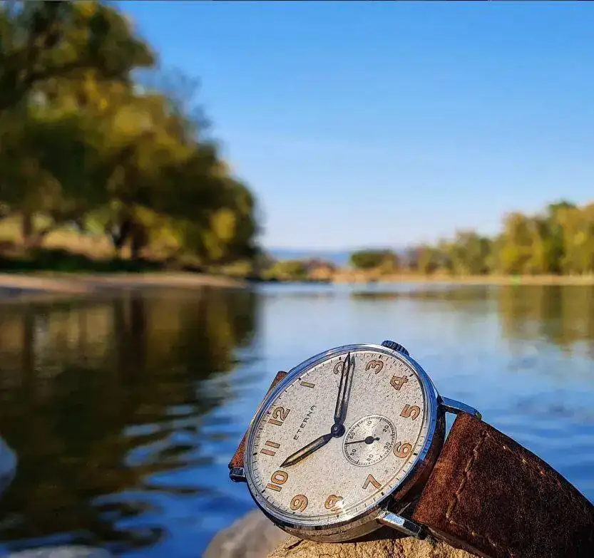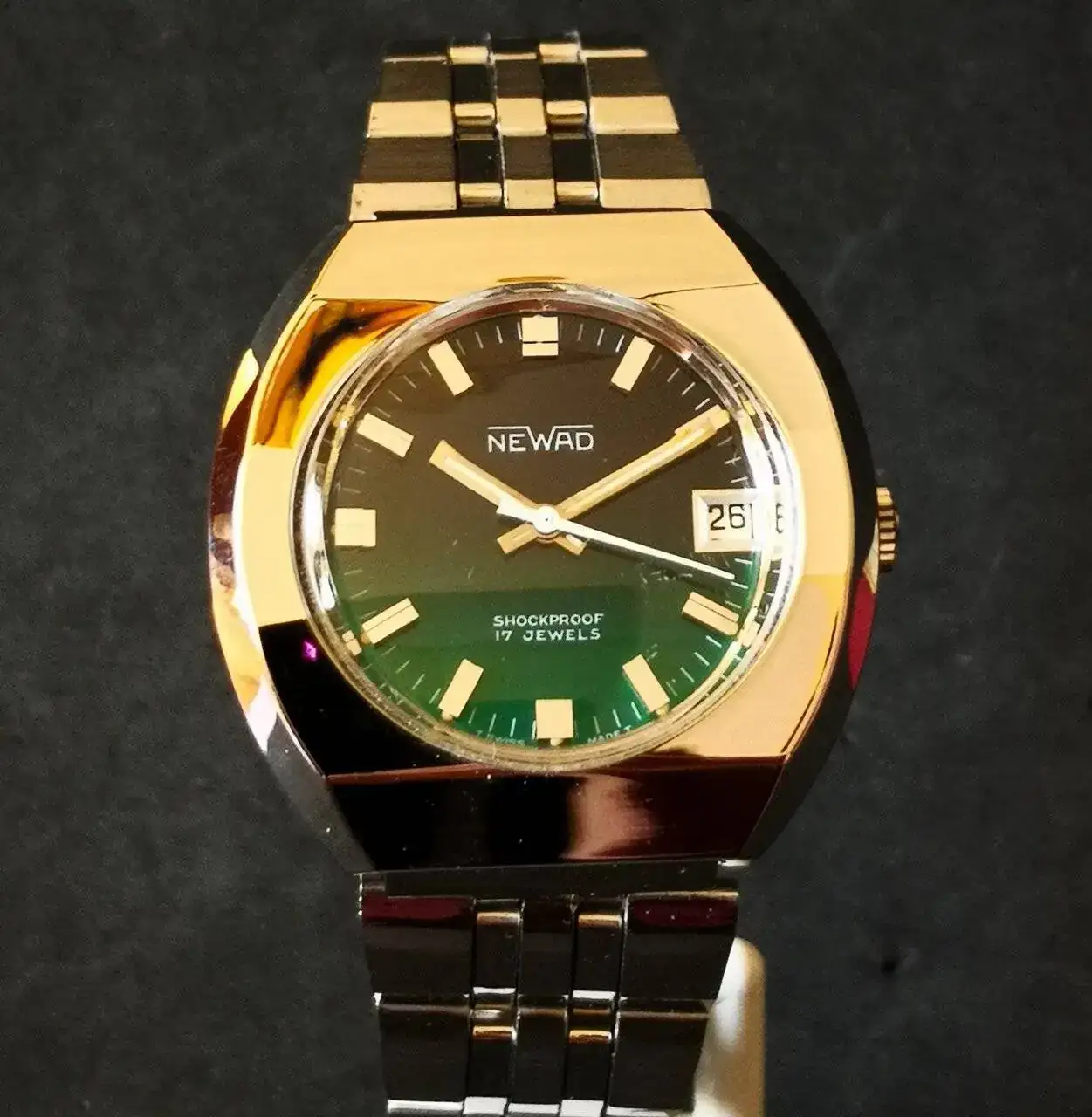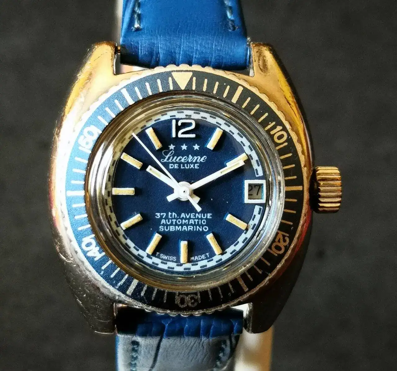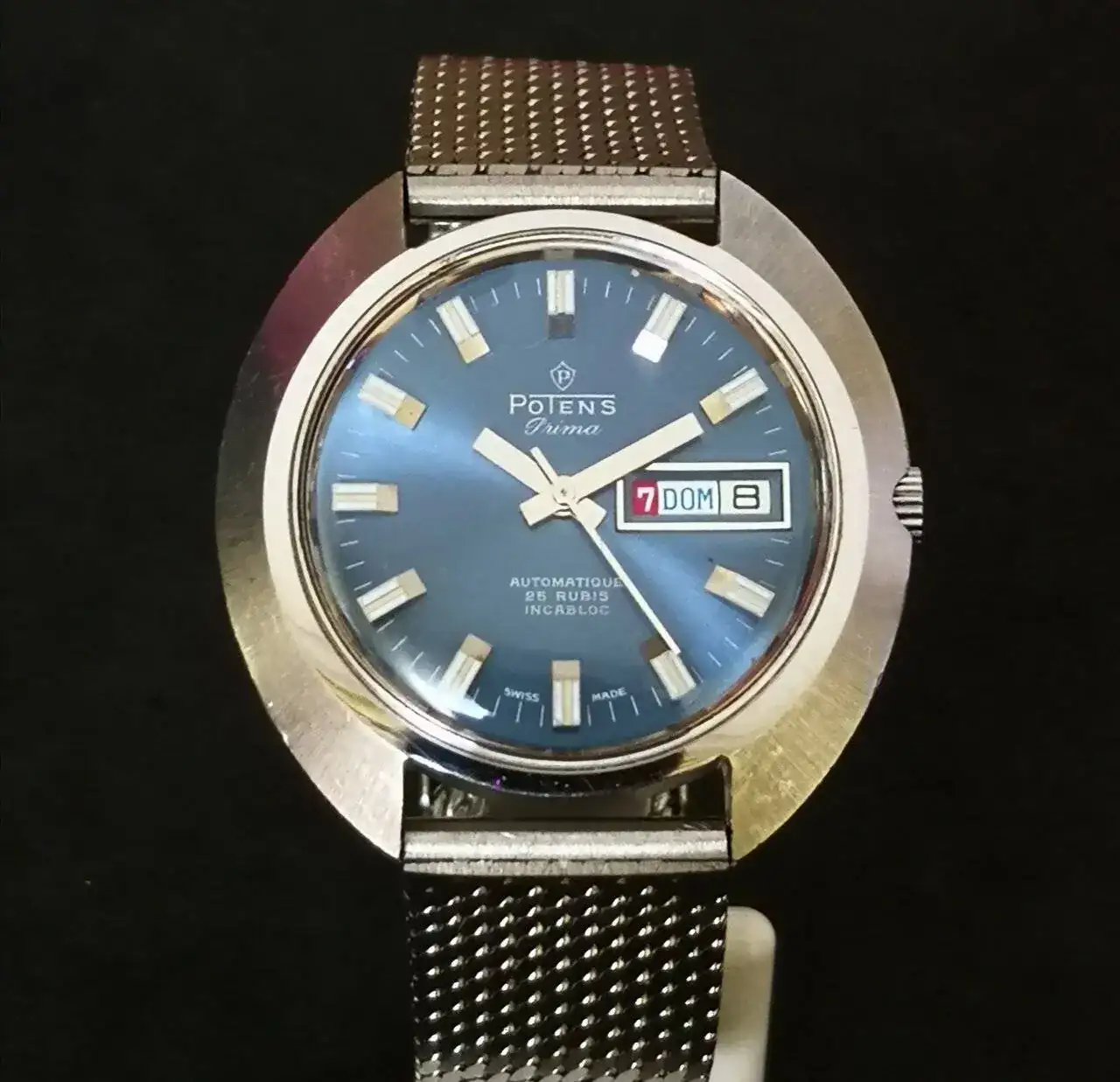 Aquí quizás el más curioso de mi colección. Perteneció también al abuelo de mi marido. Un Antic de luxe (se ve que esta coletilla les daba más caché a los relojes de antes) automático. Lo que hace especial a este modelo es su armis integrado en el reloj. No se puede ajustar ni cambiar. Es como una plancha metálica con un caucho pegado por debajo. Su esfera es de lo más cutre que he visto... Es de esos relojes que de feos que son me gustan y hacen gracia 😂