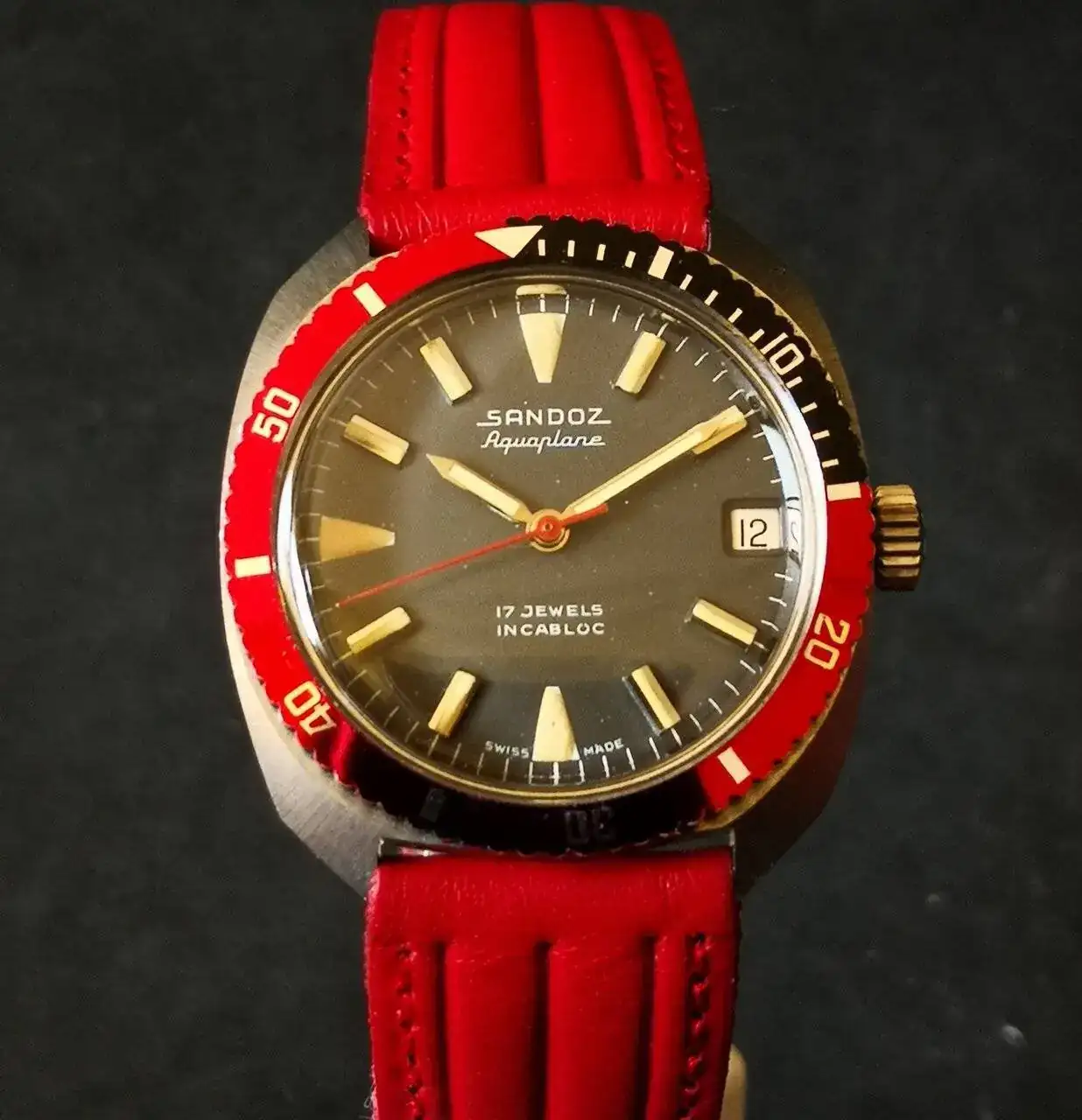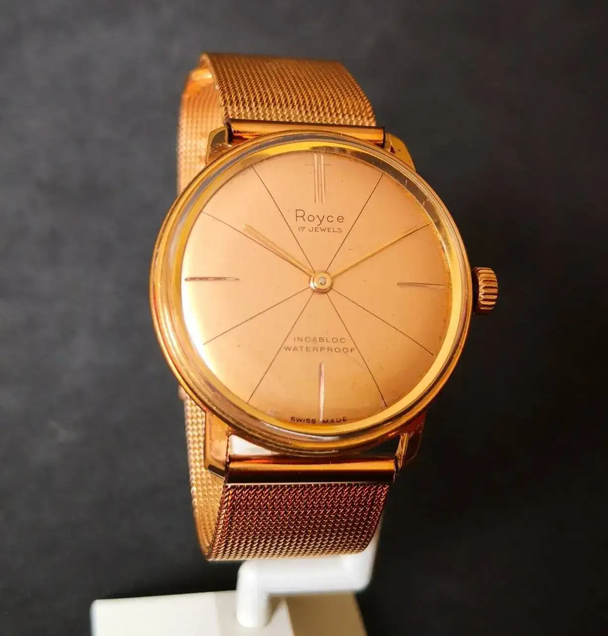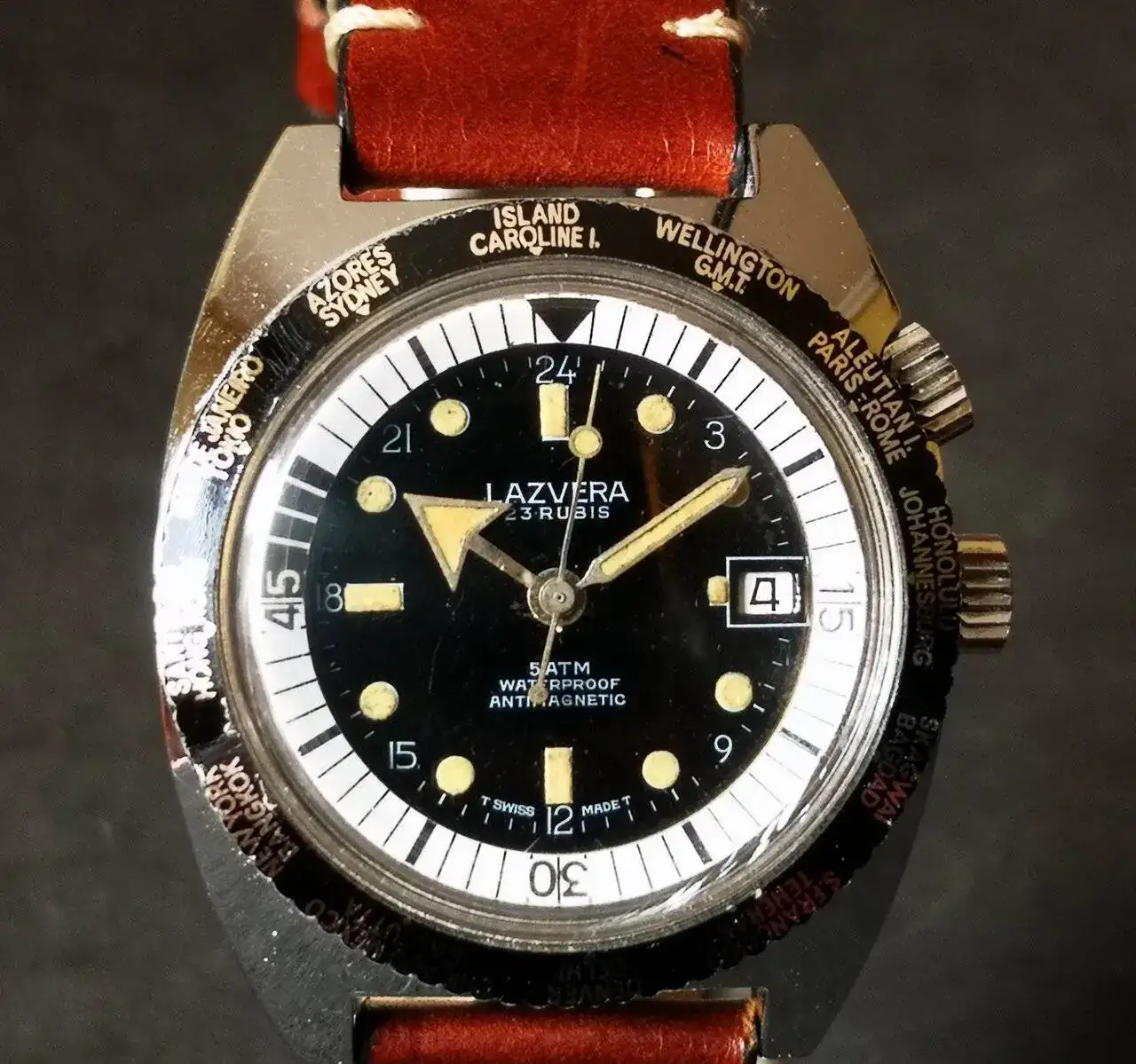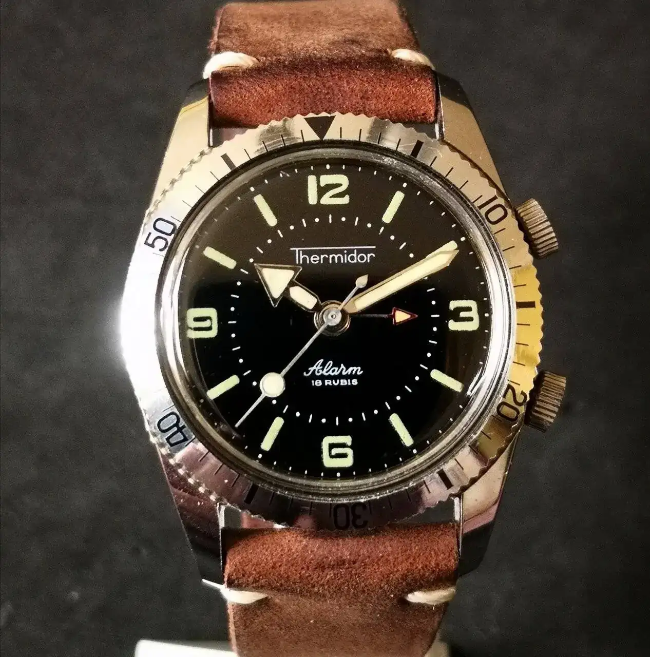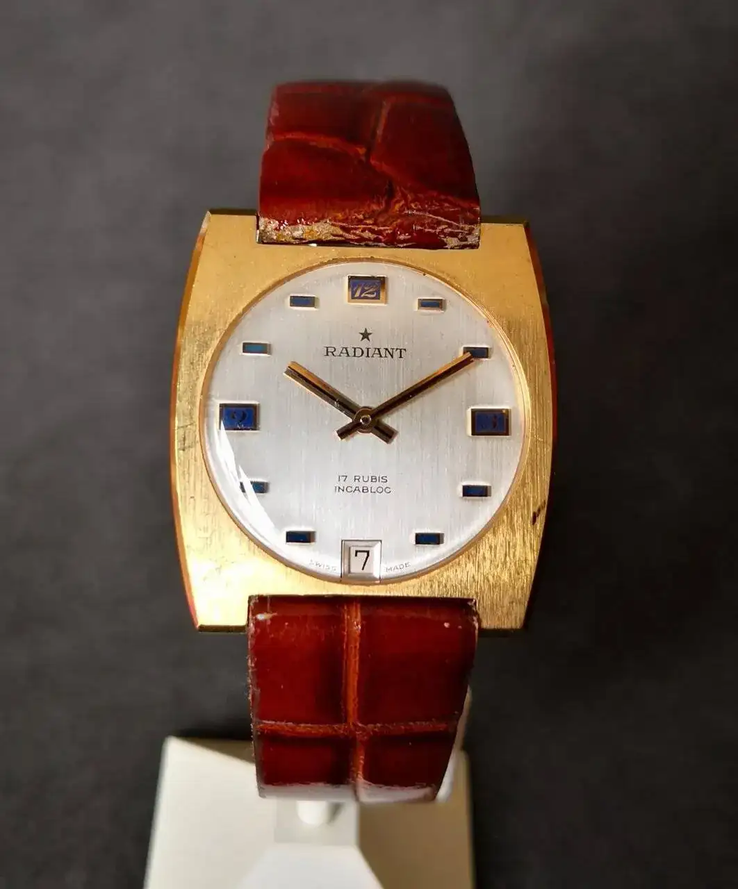 Aquí quizás el más curioso de mi colección. Perteneció también al abuelo de mi marido. Un Antic de luxe (se ve que esta coletilla les daba más caché a los relojes de antes) automático. Lo que hace especial a este modelo es su armis integrado en el reloj. No se puede ajustar ni cambiar. Es como una plancha metálica con un caucho pegado por debajo. Su esfera es de lo más cutre que he visto... Es de esos relojes que de feos que son me gustan y hacen gracia 😂