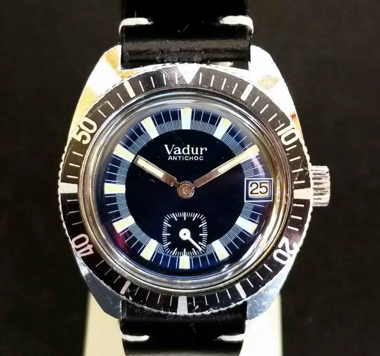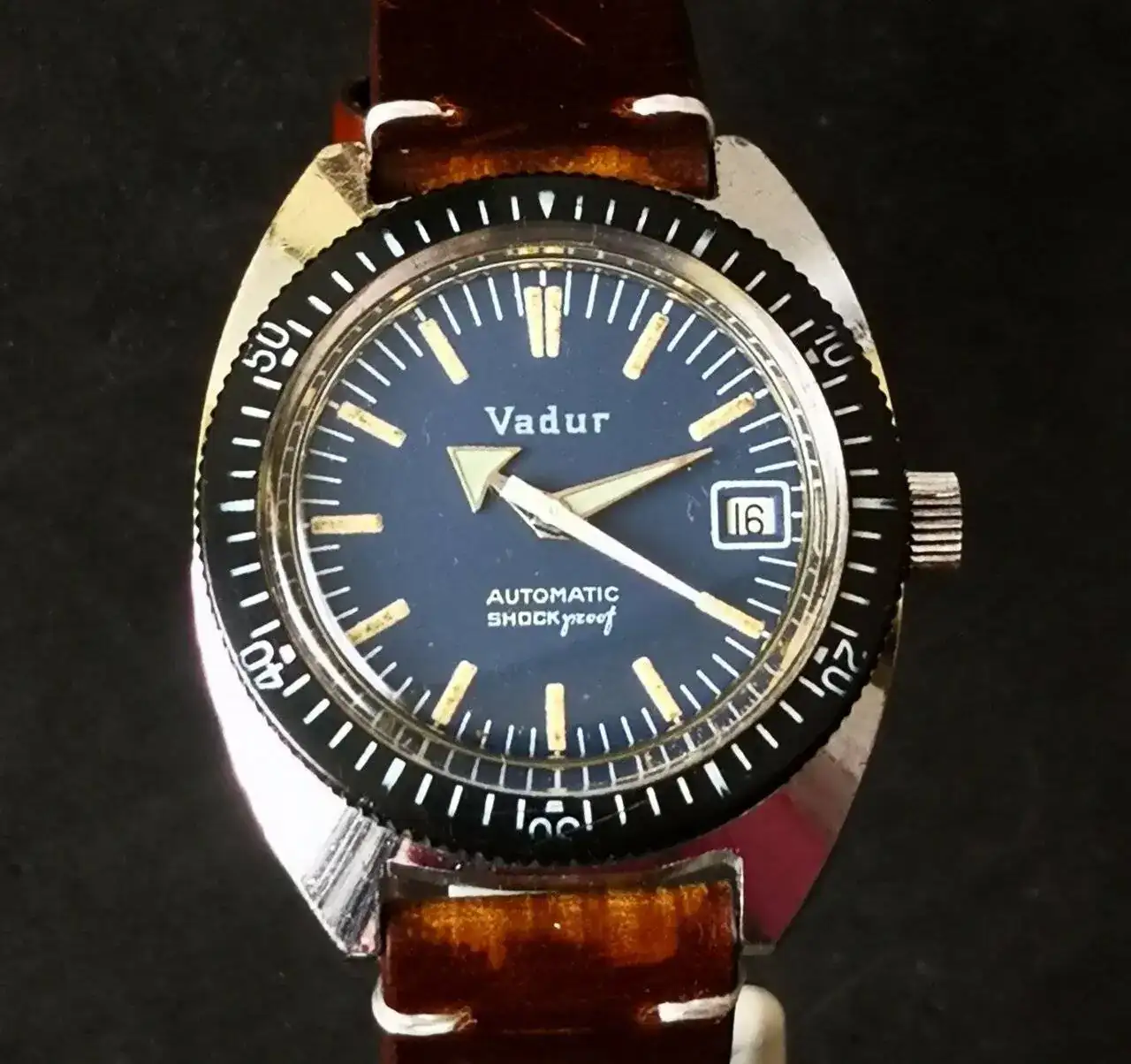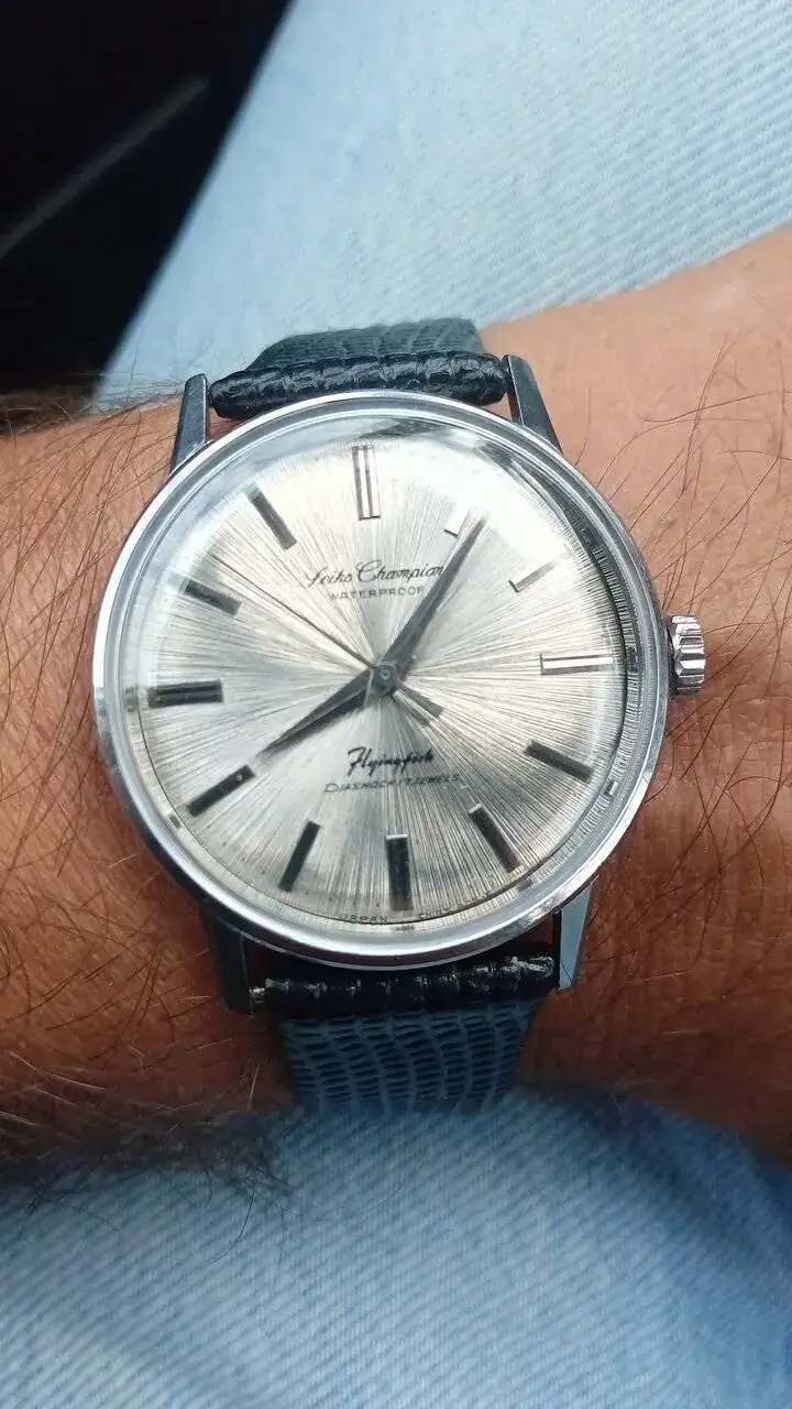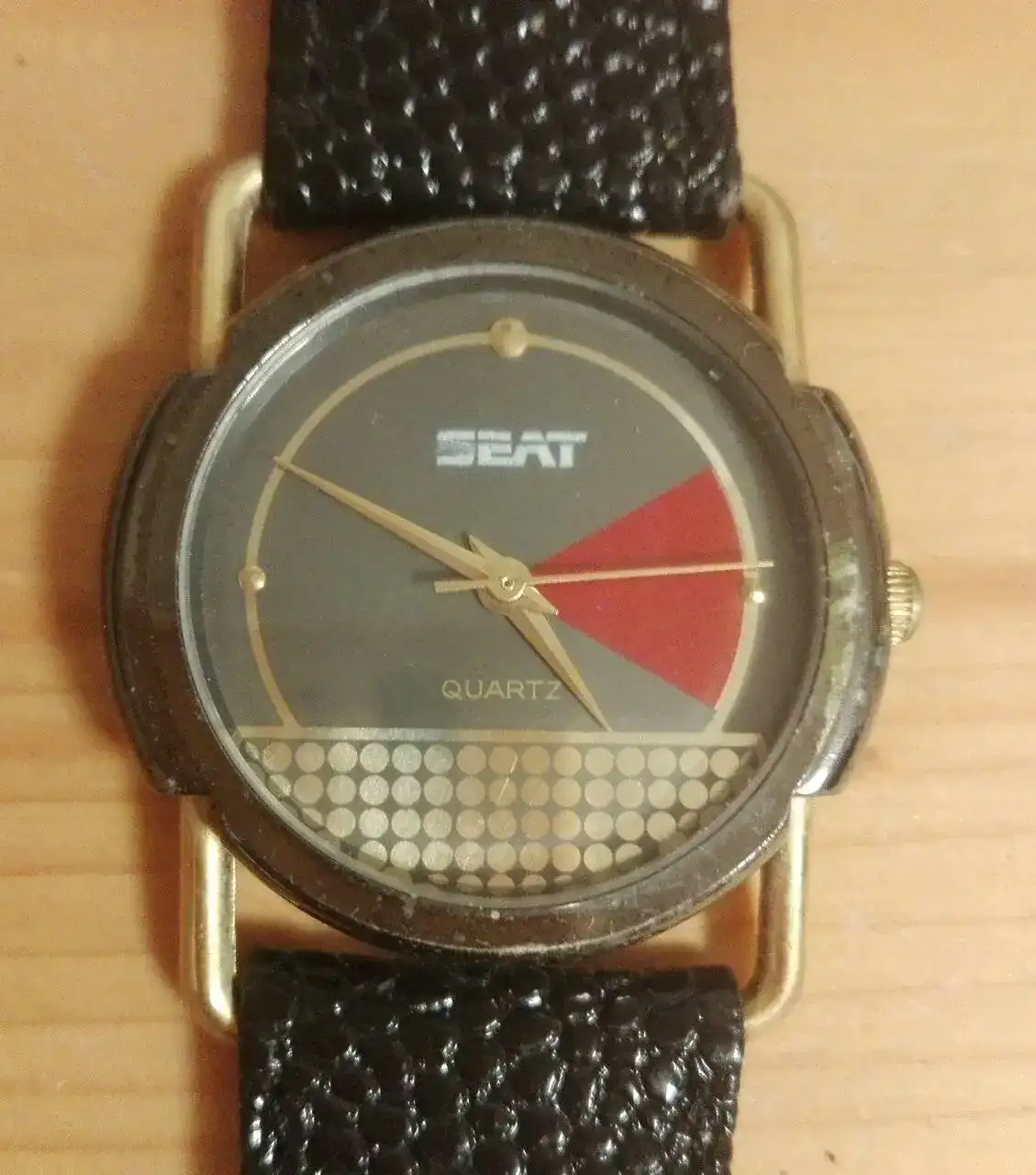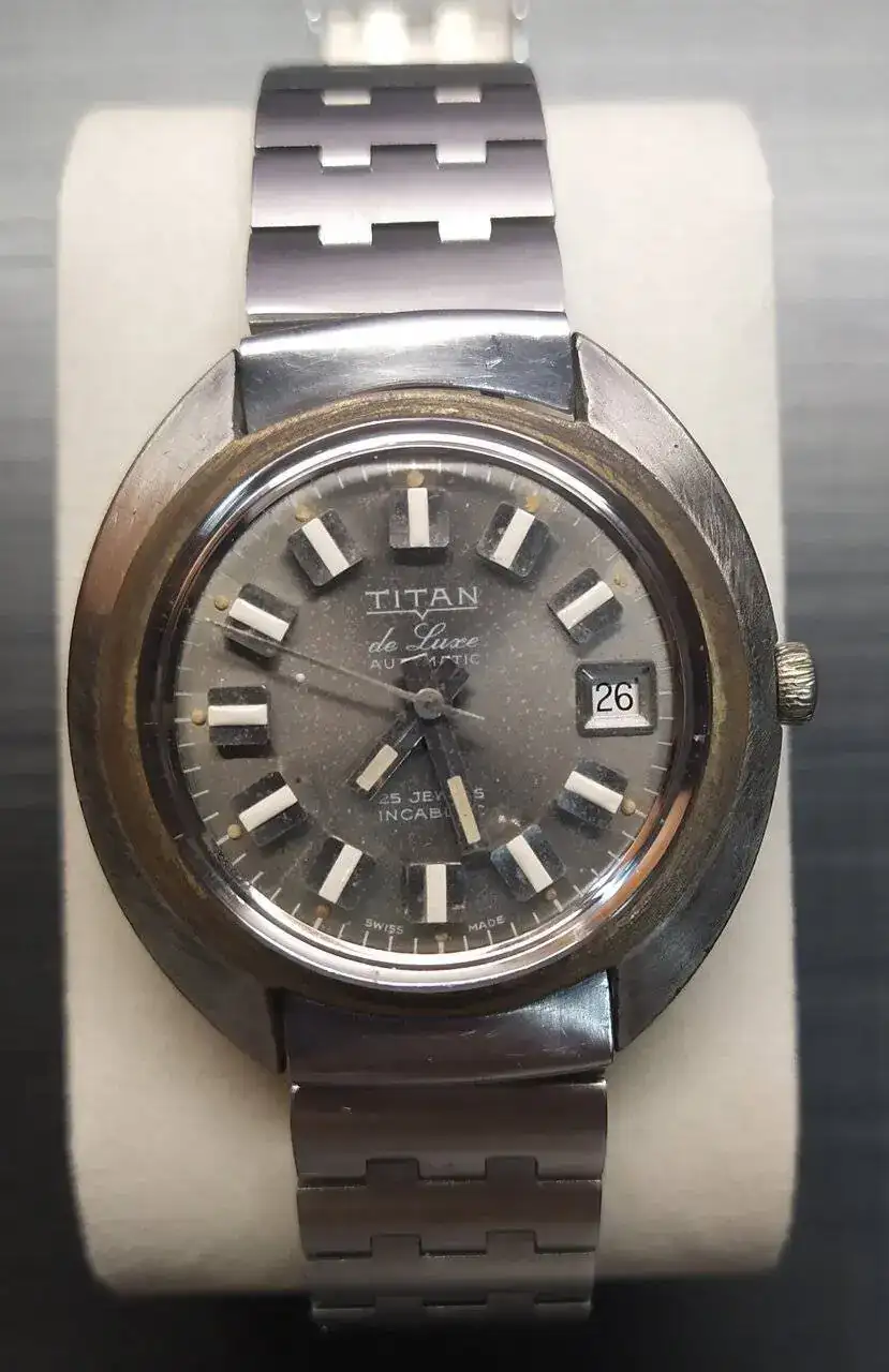 Le sigue el Titan de luxe automático que era de mi abuelo. No os tengo que decir el calor intangible que tiene este para mi. Rescatado y simplemente puesto a punto después de haber pasado quizás por el atropello de un tanque y posterior incendio por el Estado que presentaba el día que me lo dieron (juro que no exagero ni un ápice mis palabras). En batalla perdió su bisel y armis, y la caja y corona están echas polvo, pero anda la mar de bien. Una característica que me gusta de ese reloj es que parece que la parte superior de sus índices parecen de porcelana blanca.