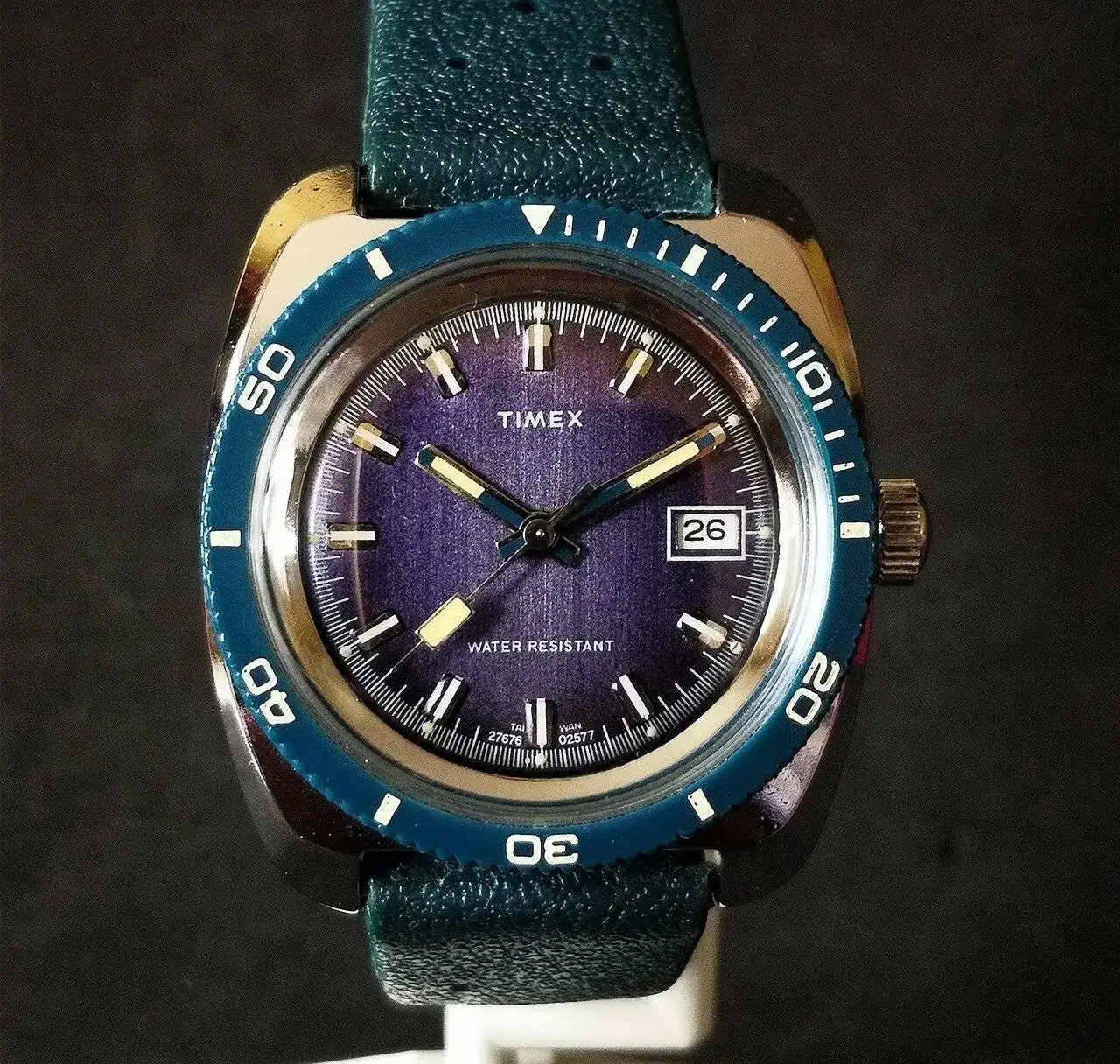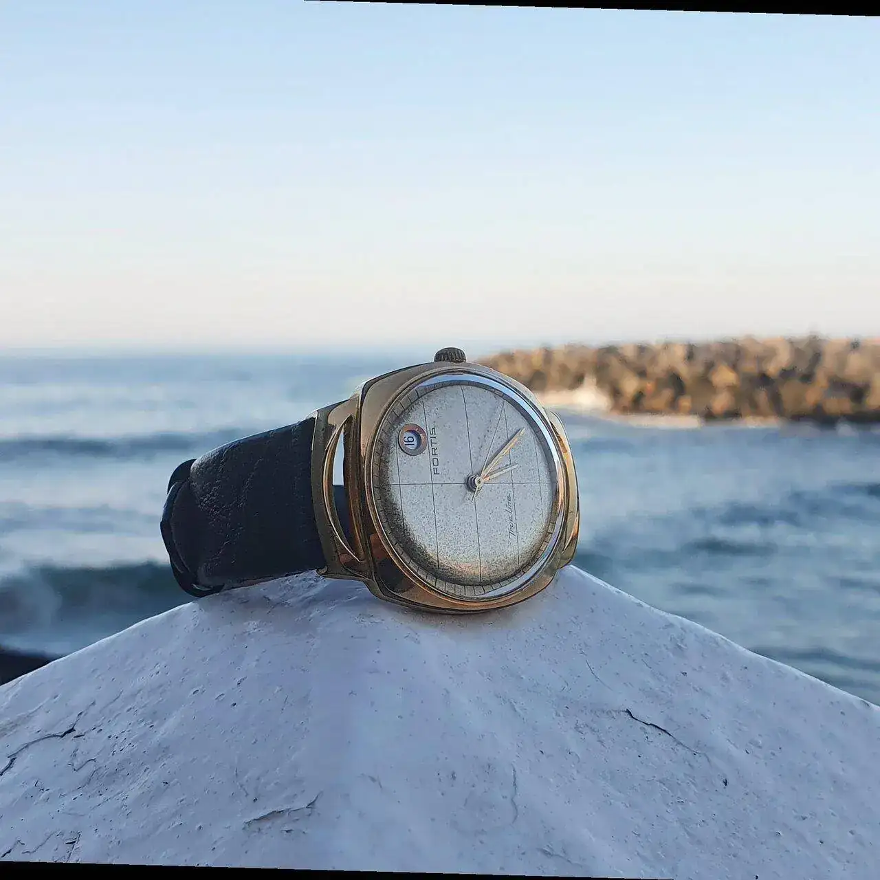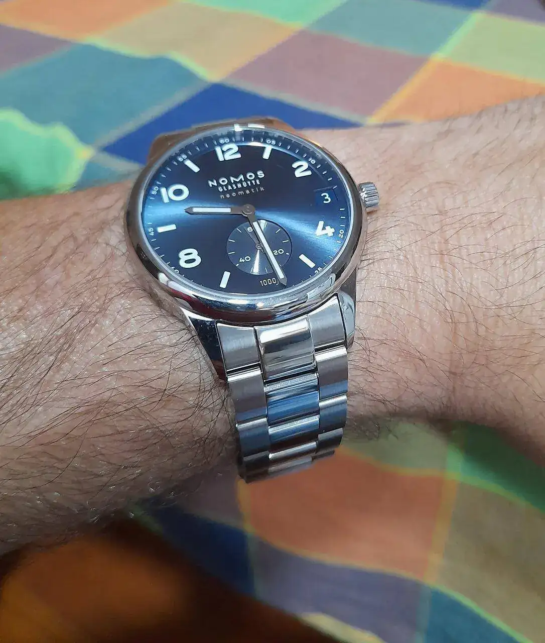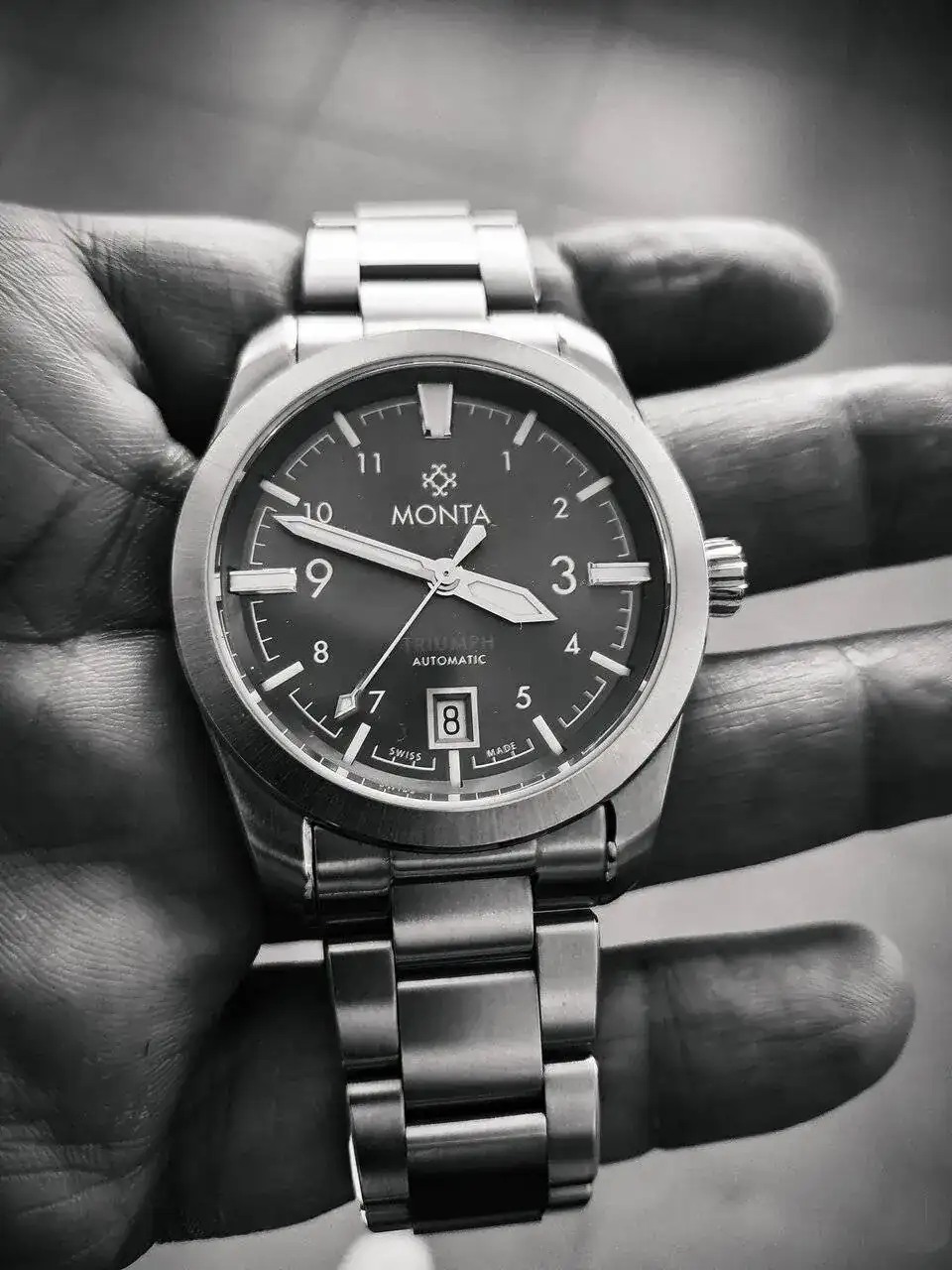 Le sigue el Titan de luxe automático que era de mi abuelo. No os tengo que decir el calor intangible que tiene este para mi. Rescatado y simplemente puesto a punto después de haber pasado quizás por el atropello de un tanque y posterior incendio por el Estado que presentaba el día que me lo dieron (juro que no exagero ni un ápice mis palabras). En batalla perdió su bisel y armis, y la caja y corona están echas polvo, pero anda la mar de bien. Una característica que me gusta de ese reloj es que parece que la parte superior de sus índices parecen de porcelana blanca.
