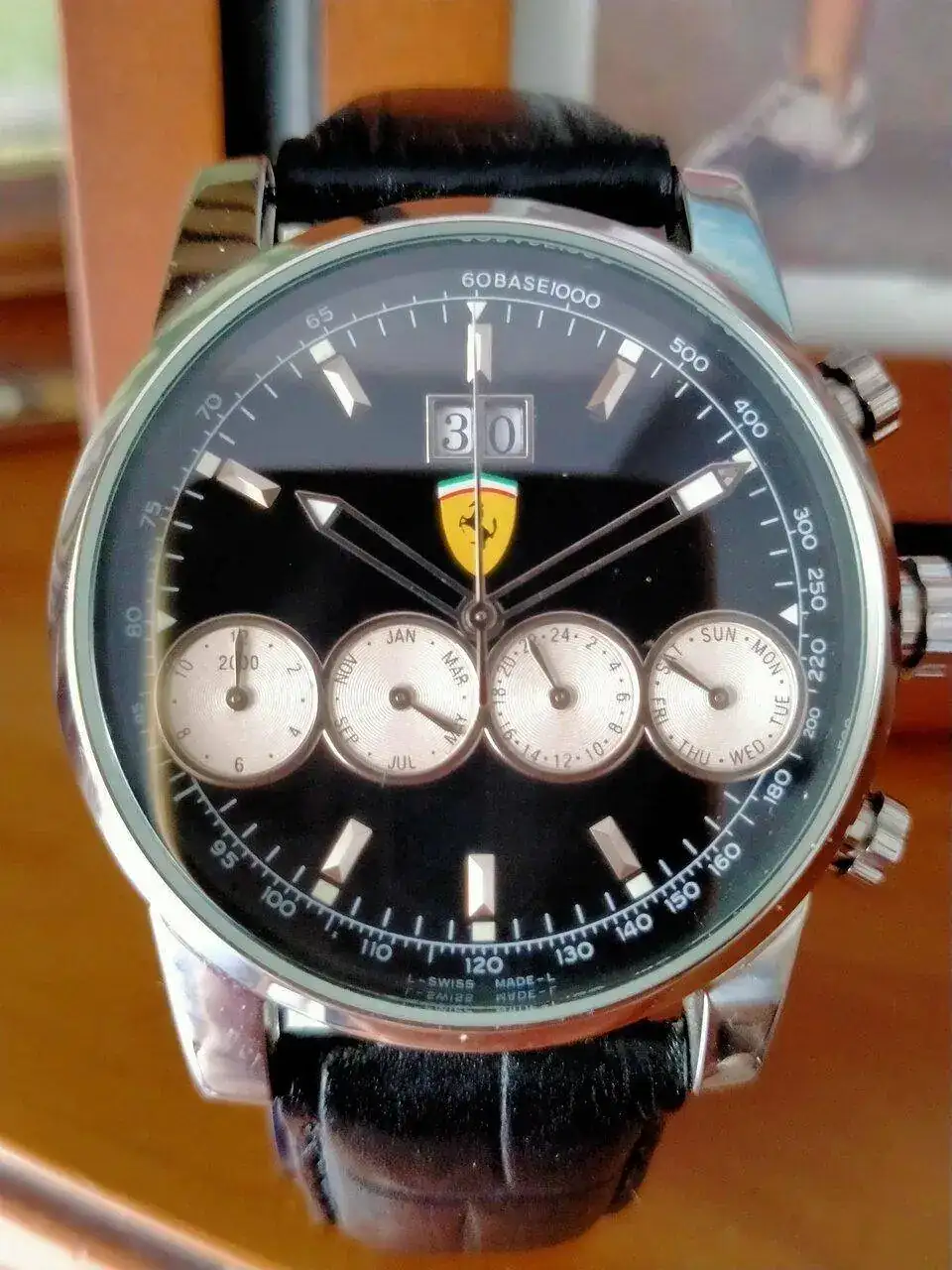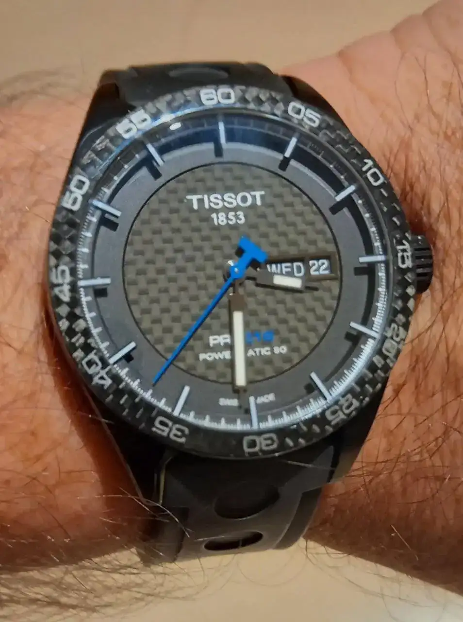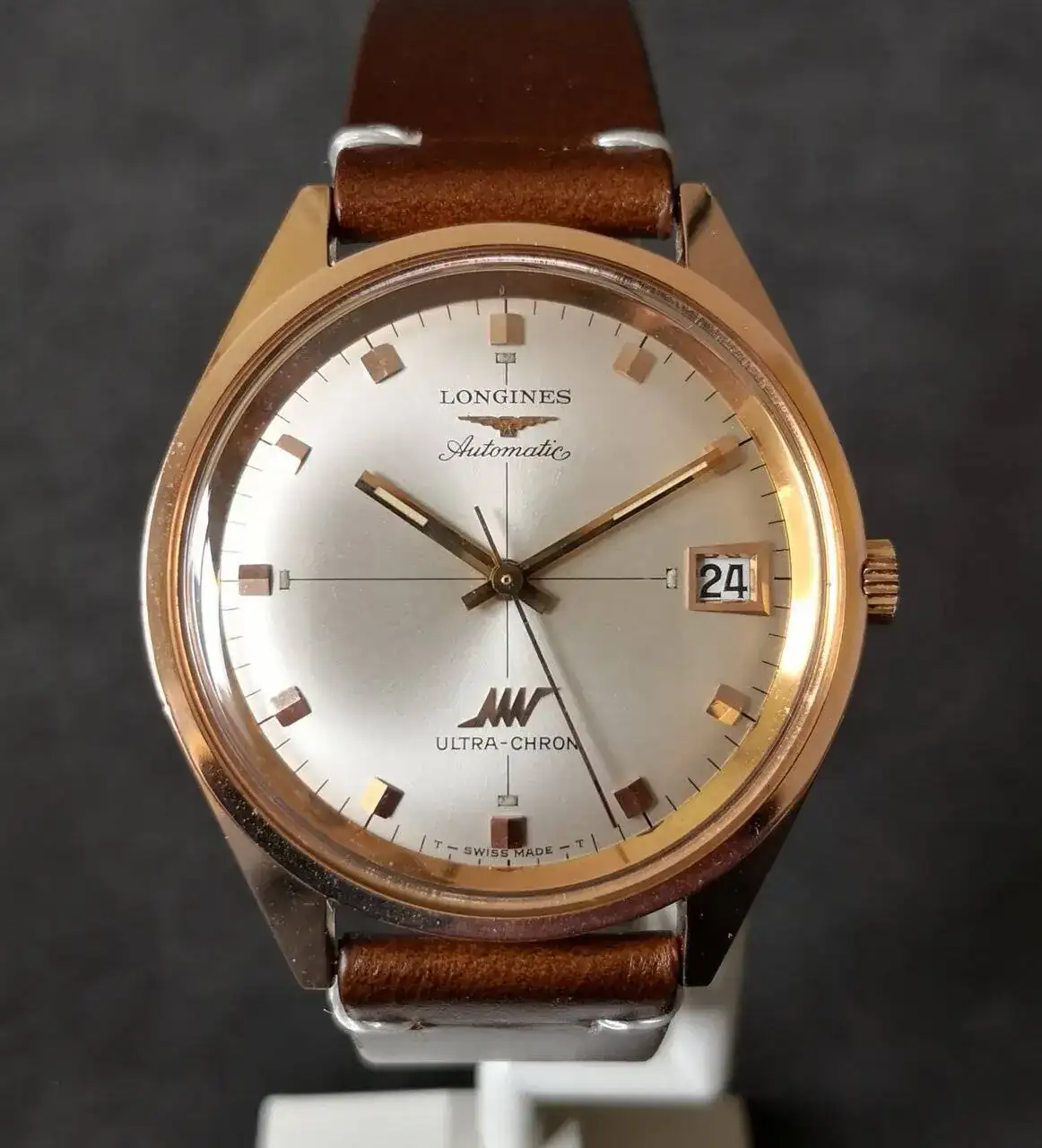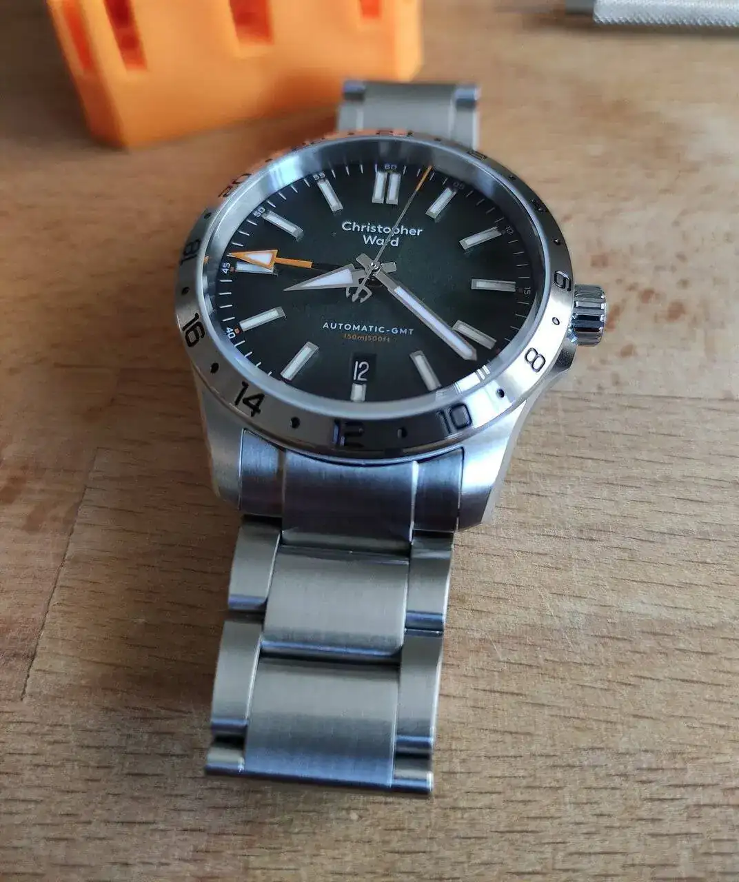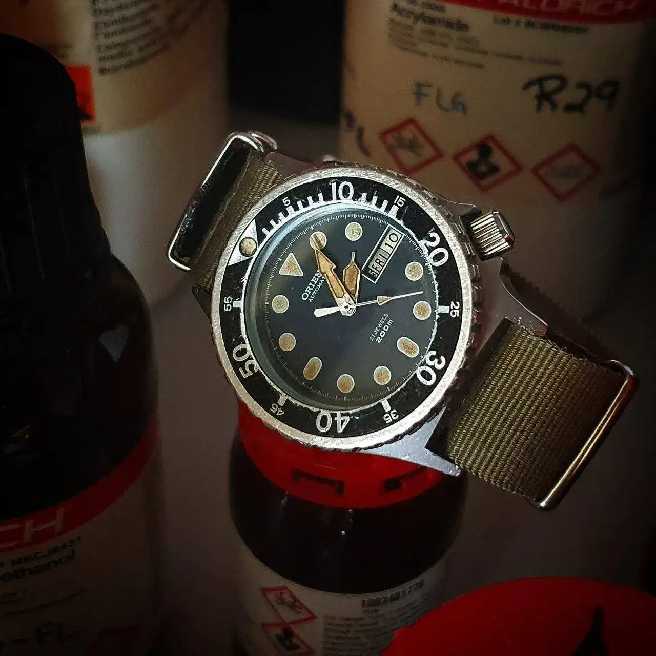 Le sigue el Titan de luxe automático que era de mi abuelo. No os tengo que decir el calor intangible que tiene este para mi. Rescatado y simplemente puesto a punto después de haber pasado quizás por el atropello de un tanque y posterior incendio por el Estado que presentaba el día que me lo dieron (juro que no exagero ni un ápice mis palabras). En batalla perdió su bisel y armis, y la caja y corona están echas polvo, pero anda la mar de bien. Una característica que me gusta de ese reloj es que parece que la parte superior de sus índices parecen de porcelana blanca.