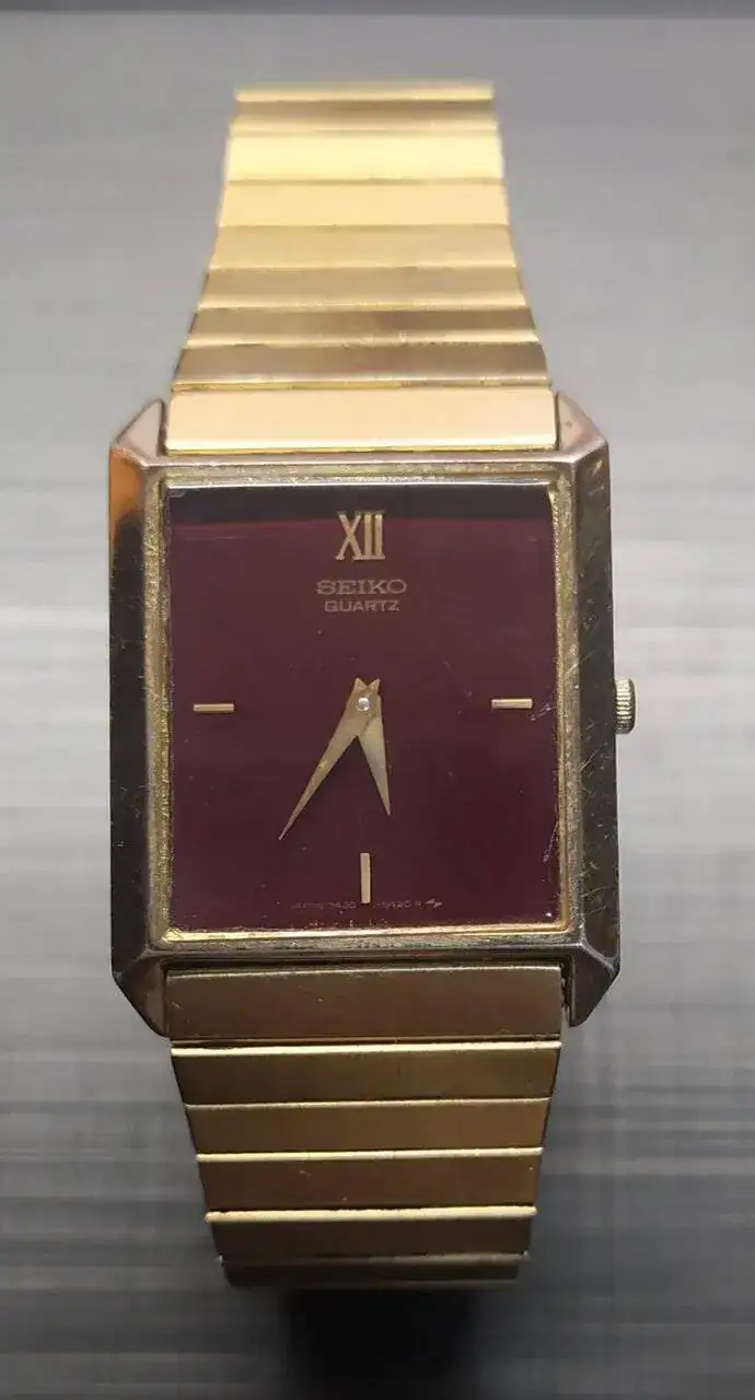 Empiezo con un cuarzo de Seiko, dorado y esfera color vino. Me gusta porque es súper finito y apenas se nota que lo llevo. Su forma rectangular me recuerda al tank de Cartier.