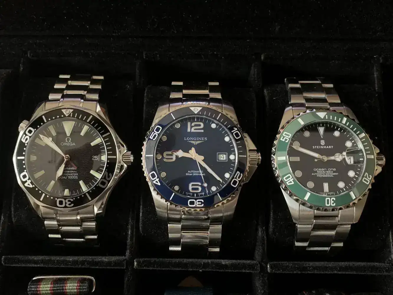 Os dejo una foto junto a dos piezas más, un SMP 2254 (41,5mm) y un Steinhart Ocean One 39 (39mm), para que veáis. El conquest, en 41 mm parecía una paella gigante...supongo que no tener bisel, da ese efecto.