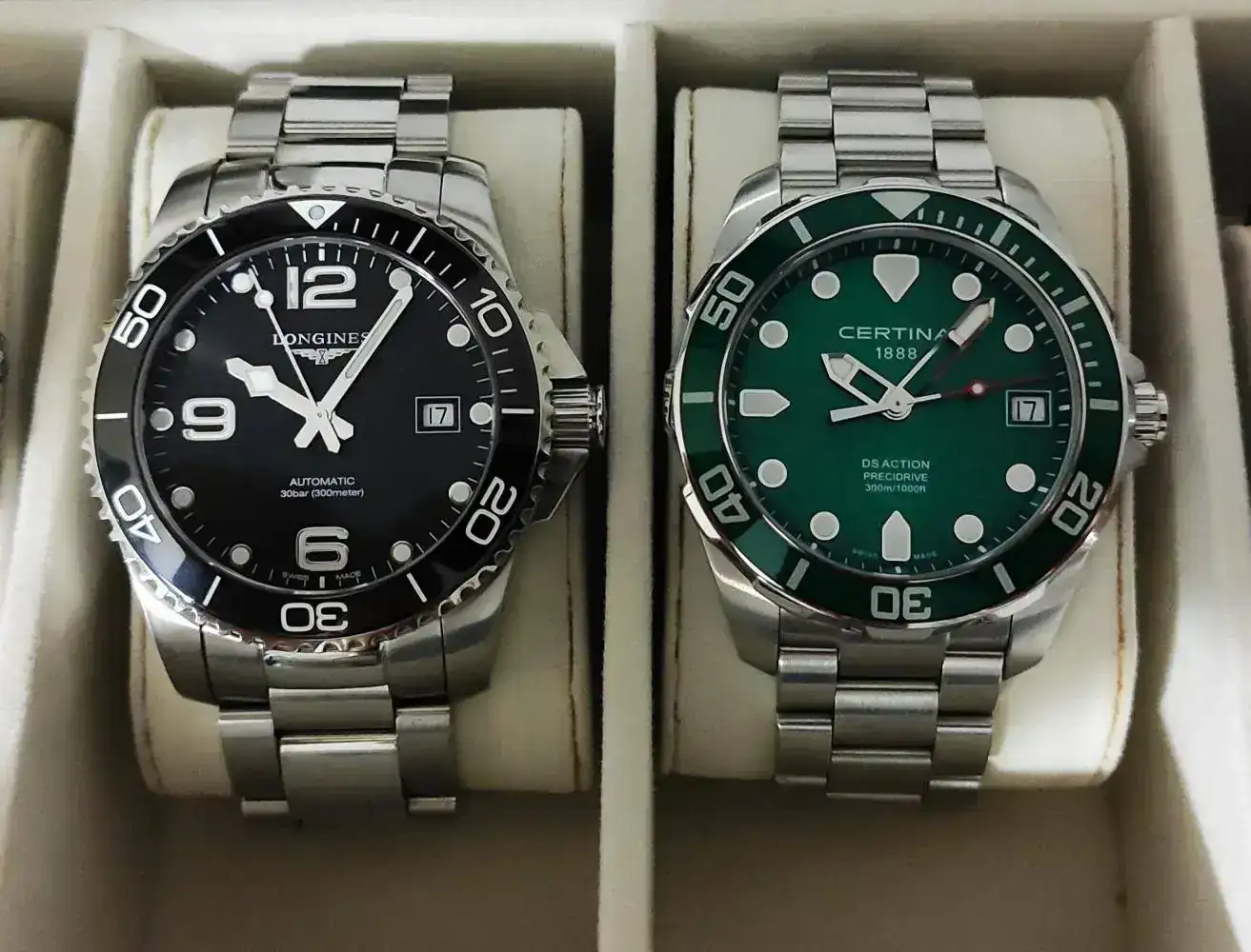 Estuve a punto de comprarme el Conquest, en tamaño 41mm. Que es el tamaño que creo que le a a mi muñeca de 16,5cm. Cuando el dependiente me lo sacó, directamente le dije que ese era el de 43 mm seguro. Y no, no lo era, el Conquest engaña a la vista una barbaridad: el que me venia bien a mi era el de 39mm, y aun así, no me parecía para nada pequeño, mas bien lo contrario. Pero al final, me decidí, y menos mal, por uno de los relojes mas bonitos y compensados que para mi, existen: el Hydroconquest Cerámico Azul. Pedí la version más pequeña, la de 41mm. Pero me sigue pasando que el otro dia, lo tuve que llevar en garantía para que lo ajustaran (no se si magnetizó o que paso pero iba perfecto y de repente dejo de ir bien).