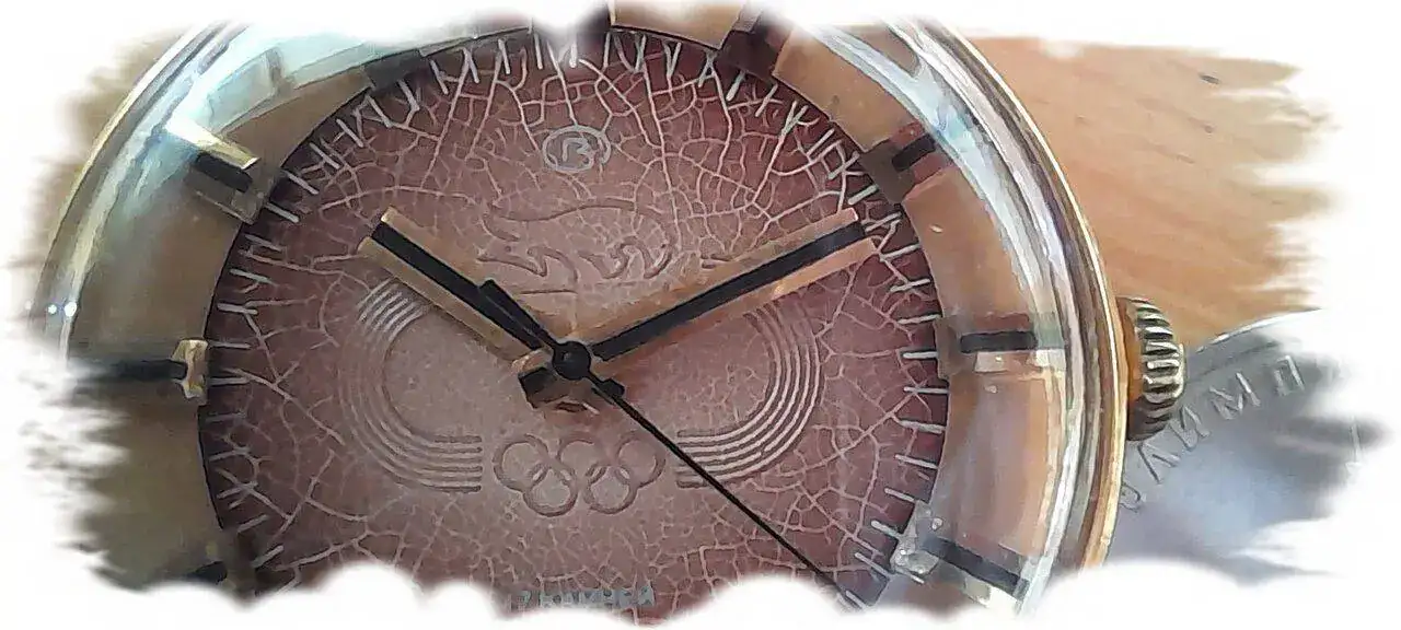 - Boctok. No es el más grande de todos, pero lo parece. Reloj de carga manual. Dial con dos colores: exterior color crema o color galleta, interior, color café o chocolate, craquelado, no sé si original o aparecido con el paso del tiempo. Tres agujas, sin fecha, emblema al centro e índices horarios. Es el único con tapa trasera grabada con el emblema olímpico, además de tener otra grabación con fecha 9 de mayo de 1979 que no parece cirílico, parece armenio o georgiano.