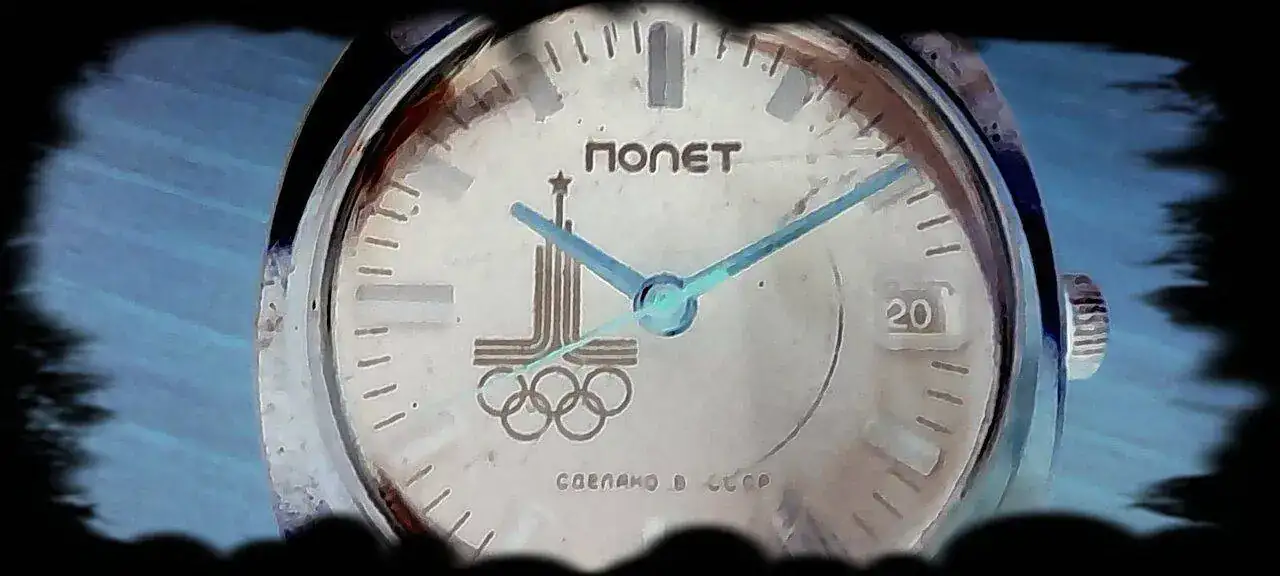 - Poljot (Полет). Reloj de carga manual. Caja redonda. Dial color azul profundo saturado, textura de tela elegante. Fecha a las tres. Emblema olímpico a las 9. Segundero central e índices horarios. Corona con guardas. Bisel poligonal.