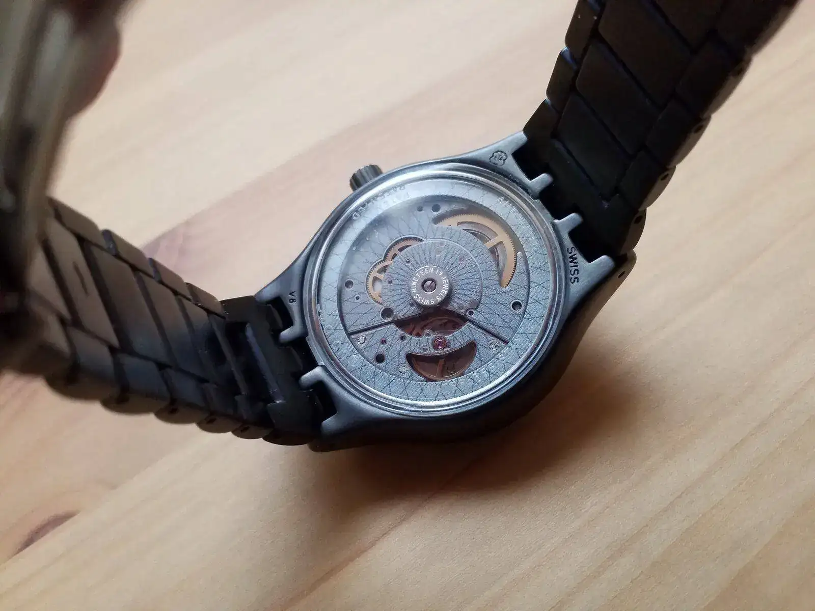 A mí me han regalado uno estas fiestas y pienso lo mismo.Yo tengo un System51 (automático) de Swatch hace un par de años. No tiene parada de segundero, pero es de lo más original que puedes tener sin pagar una auténtica barbaridad por él. Siendo del grupo Swatch, el calibre es un ETA. Tiene el fondo visto y el volante es muy especial, estando en el exterior del calibre. Va muy fino y cumple su cometido.