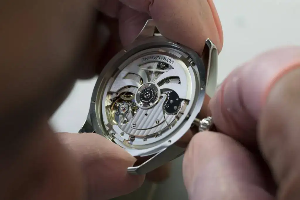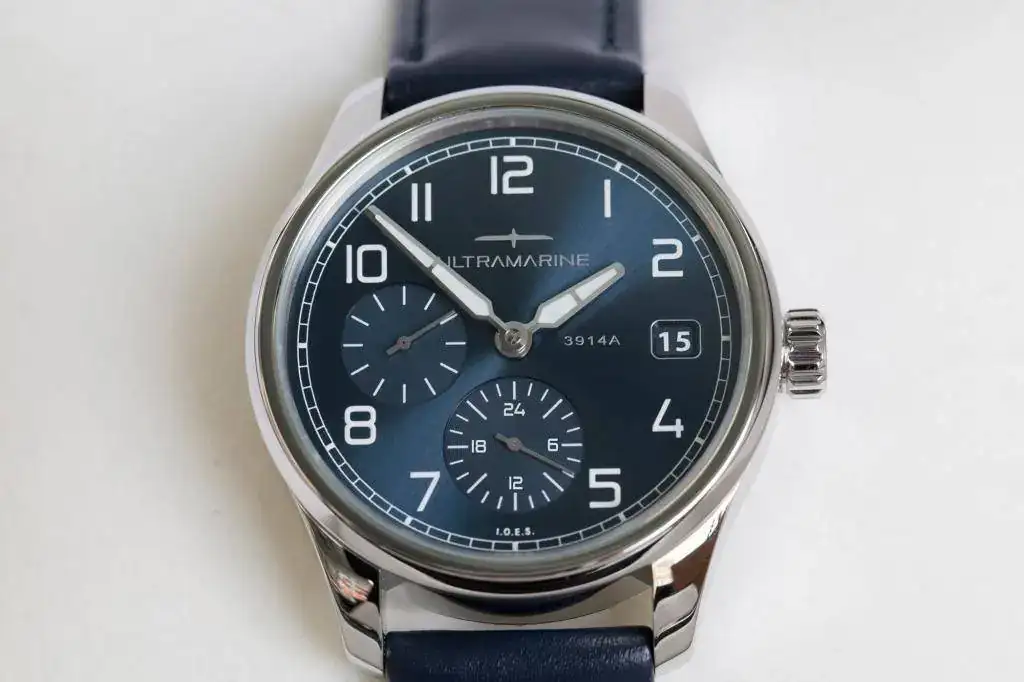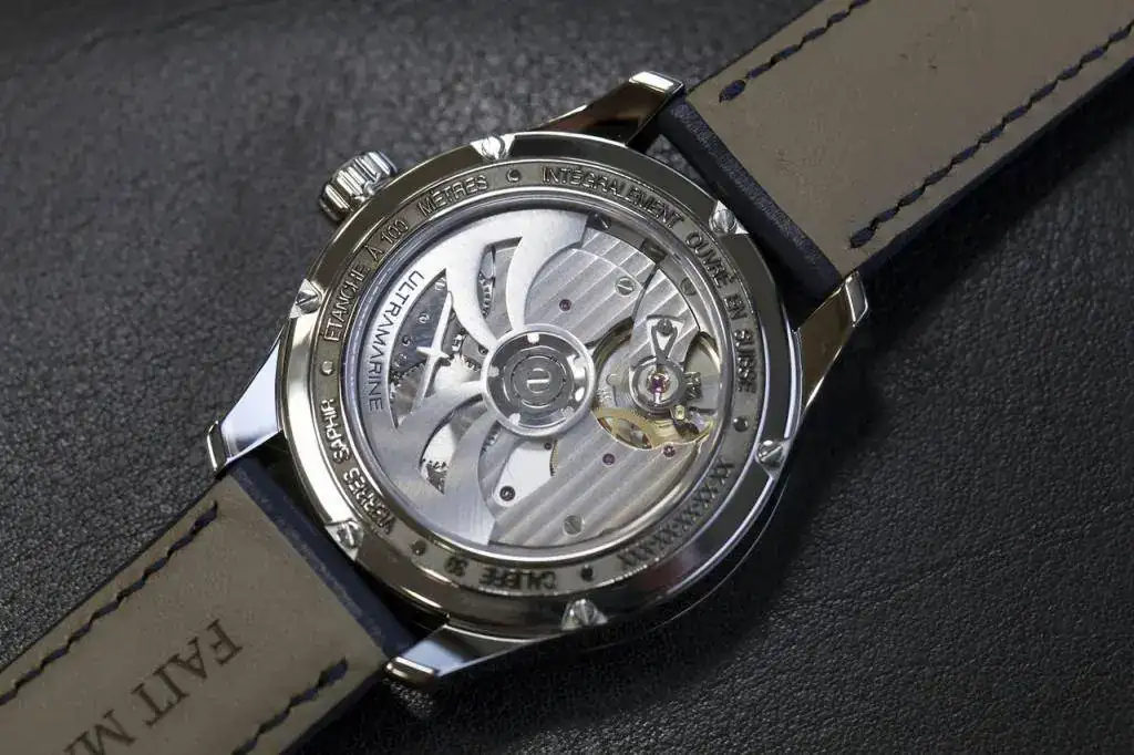 Las cajas en Neuchâtel, las esferas, correas (cosidas a mano) y hebillas en La Chaux de Fonds, y los cristales de zafiro en Courgenay. Y el calibre, un Eterna 3914-A (por automático) con fecha, 65 horas de reserva de marcha y segundo huso horario, es de Grenchen.