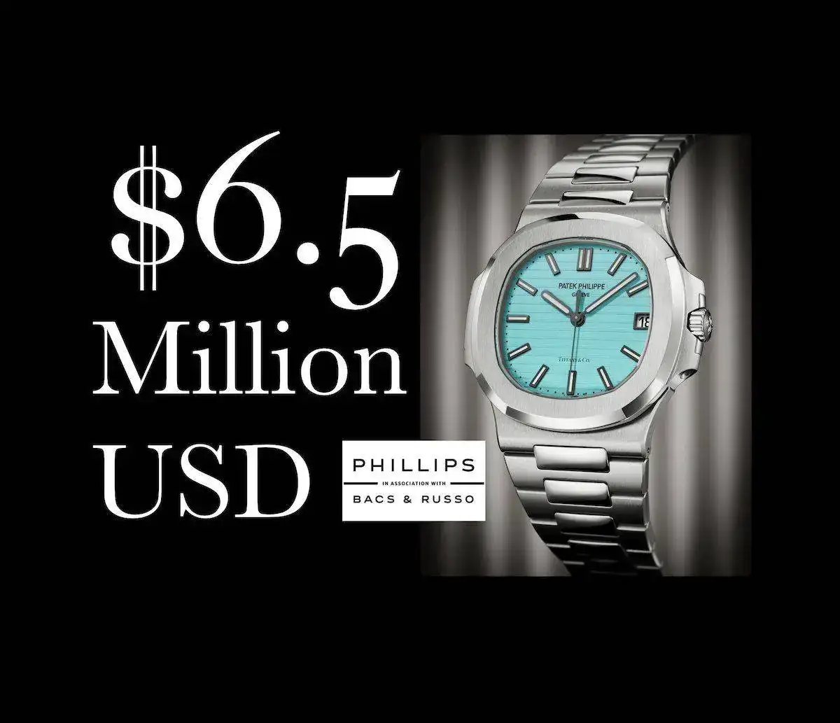 En los últimos meses estamos asistiendo al "Boom" de la "Azul Tiffanymanía"; todo ello desde que Patek decidió dedicar su última serie del mítico Nautilus 5711 a la emblemática joyería con la que colabora desde hace décadas. Y para ello ha elaborado una serie limitada de 170 ejemplares del reloj con él color típico de la joyería y cuya primera unidad se puso a la venta en una subasta benéfica realizada en Phillips, el precio alcanzado fué simplemente increíble : 6,5 millones de dólares.