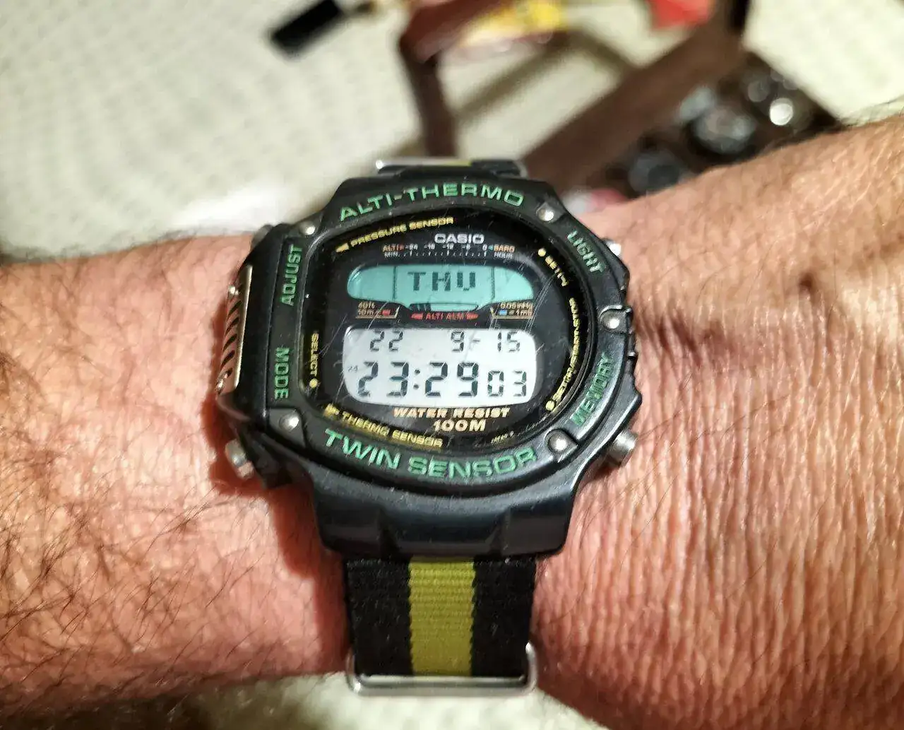 Mi primer reloj con altímetro fue este que adquirí sobre 1994. Currado y trabajado hasta el extremo, una magnífica herramienta con una frágil correa. Una vez se me cayó de un coche en marcha, porque parados en un sitio lo dejé sobre su techo para comprobar el frío que hacía, y al irnos me olvidé de él, acordándome al poco y volviendo a por él, con la suerte de encontrarlo.