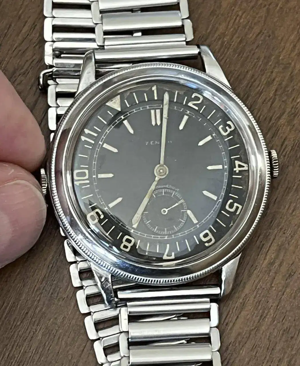 Respecto a esto último, y teniendo en cuenta la trayectoria de Zenith respecto a los relojes Pilot desde 1918, este modelo bien pudo ser fabricado para un piloto concreto o bien como prototipo para pilotos, viendo el ambiente pre-bélico que se respiraba en la Europa de 1936; y sus especificaciones responden al objeto de mantener un doble horario o bien de mantener referencias de navegación como había descrito poco antes el celebre Philip Van Horn Weems. No tengo ninguna certeza, ni desde Zenith pudieron aclarar este punto, pues en sus archivos sólo figuraba como Reloj de pulsera en acero inoxidable "Staybrite". Si puedo añadir que esos brazaletes "Bonklip" fueron muy usados por pilotos de la RAF en esas fechas.