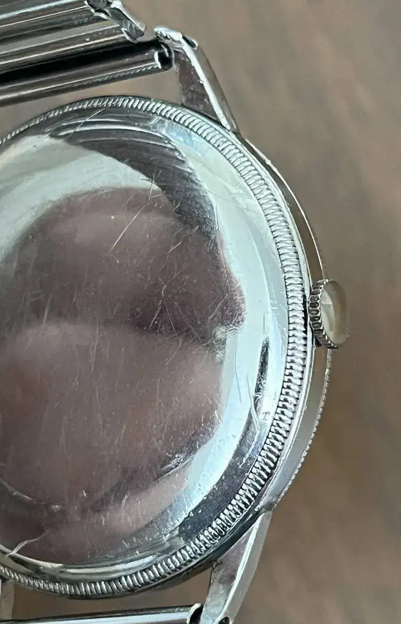 Pues pensamos que la fecha es errónea y que su fabricación es mínimo 25 años posterior a la que nos están diciendo. Aunque nos sorprende ya las estriaciones que presentan tanto la tapa trasera como el aro delantero para su roscado, pues nos recuerdan enormemente las tapas de los Rolex, y aunque ya las hemos visto en relojes anteriores, nunca en un tamaño de 41 mm.