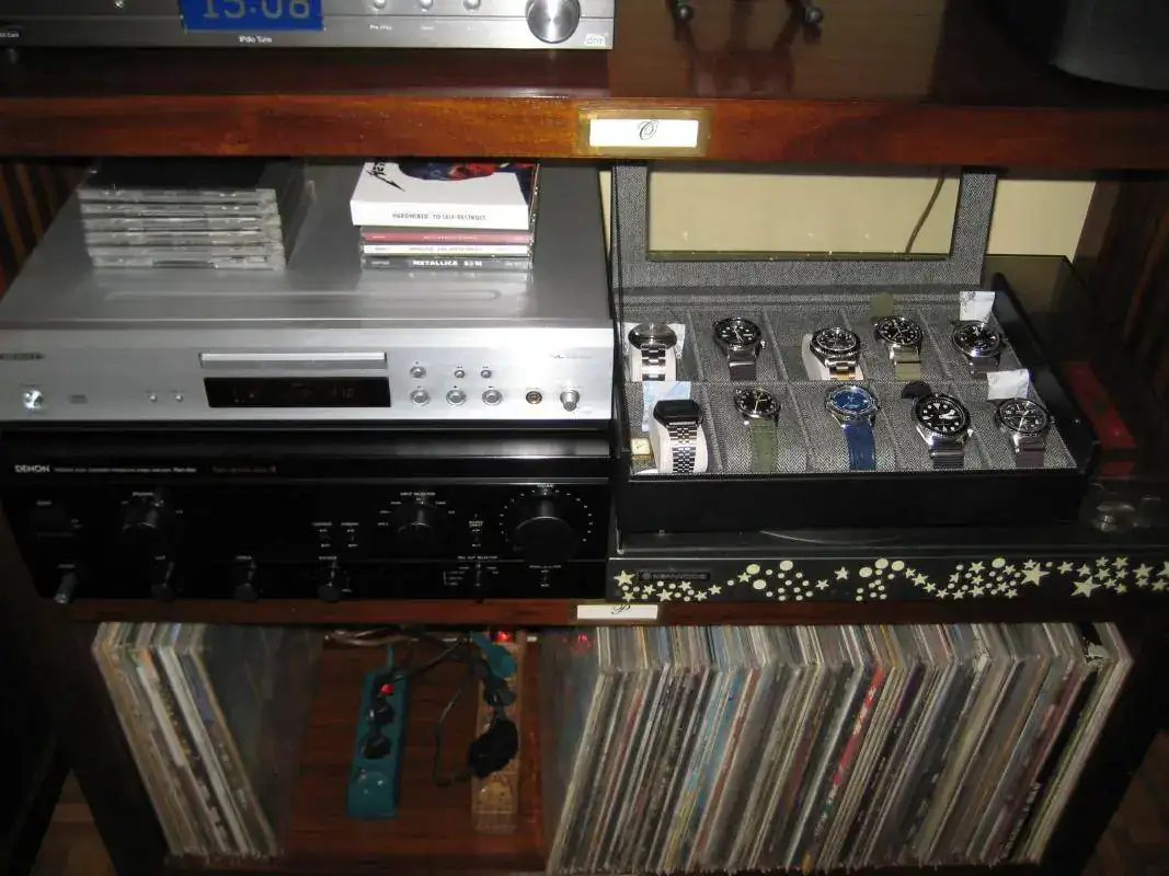 . Destacando de más a menos cariño: Seiko cuarzo de finales de los 70 heredado de mi hermano; Rolex Submariner 14060M Four Lines; IWC Mark XV; Breitling Colt regalo de mi padre... Aquí con el equipo de alta fidelidad de mi tatarabuelo: Un fonógrafo de 1890 Columbia rescatado por mi padre del desván de la casa familiar y que me regaló a mí hace muchos años. Todavía funciona.