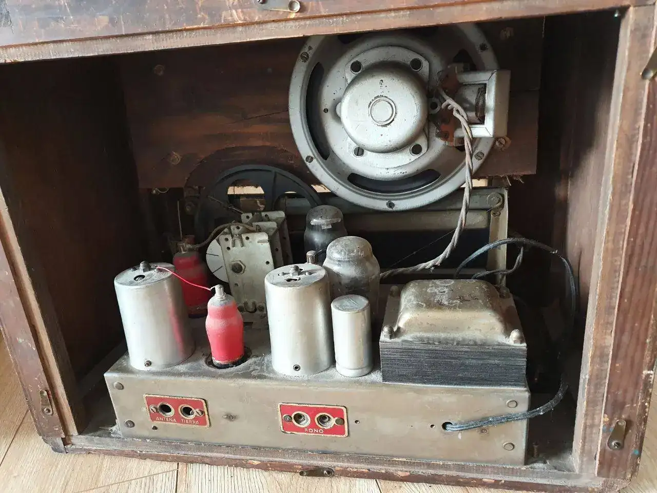En las fotos dos antigüedades: un reloj de bolsillo de sol y un gramófono.