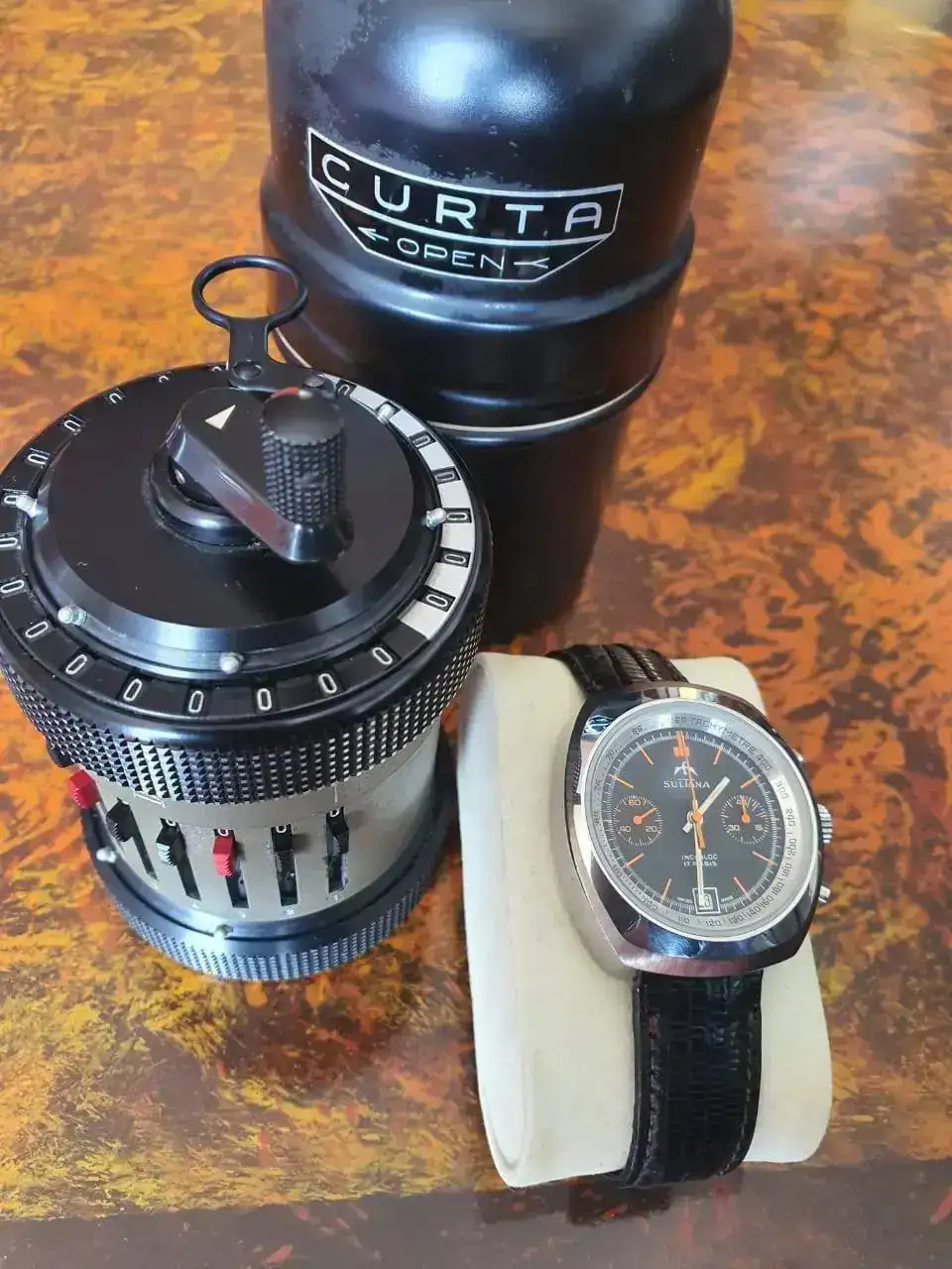 Dos maravillas mas.Incluyo también la que se considera el santo grial de las calculadoras mecánicas, la ultra famosa Curta Tipo II (mejorada y con más registros en comparación al Tipo I), diseñada en los campos de concentración de la segunda guerra mundial por Curt Herzstark junto a un cronógrafo a cuerda Sultana que monta un calibre Valjoux 7734 con 17 joyas el cual utilizaban marcas de solera como Breitling, Tudor, Heuer, etc.Ver el archivos adjunto 917168 Ver el archivos adjunto 917169