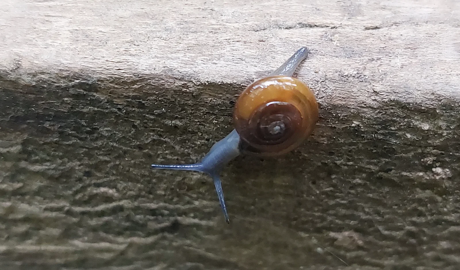 Lo que parece ser Oxychilus alliarius (caracol de ajo, caracol de concha de cristal)