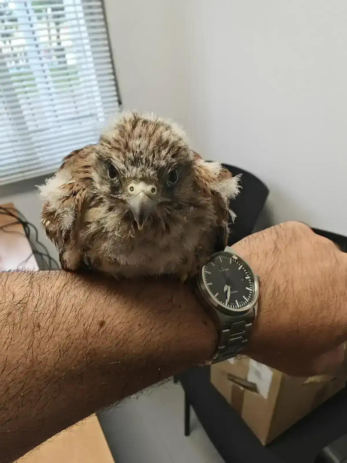 Buenos días! Un pollete de cernícalo vulgar que se ha caído con las calores. Ya está avisada la protectora de aves pero me he acordado del hilo.