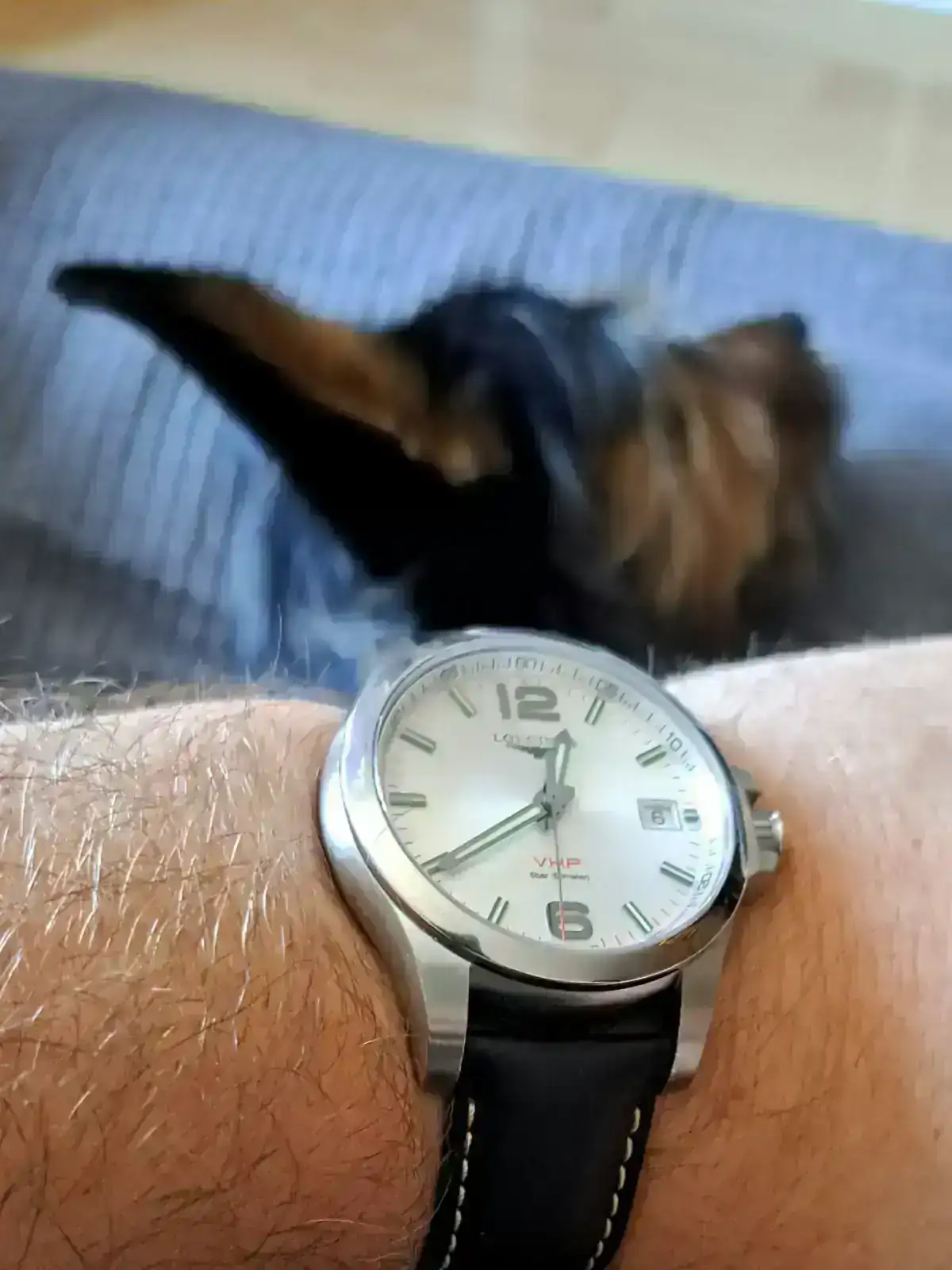 Longines Conquest VHP y uno de mis perros, Archie. Cruce de yorkshire y sabe dios que más rescatado de la calle.