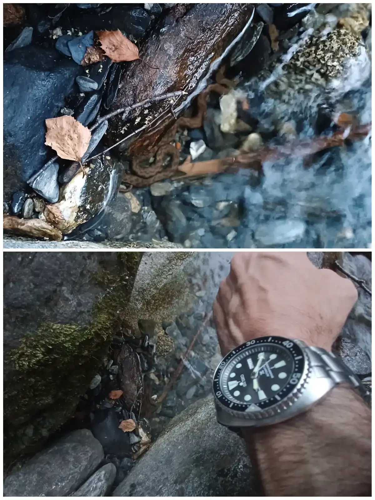 ¡Qué bueno! Me ha hecho recordar que yo fotografié a una culebra de agua a finales de julio, en la zona de Benasque. Le dio un susto de muerte a mi hija porque estaba en unas ramas que ella fue a recoger, al instante se sumergió en el río. Creo que no llegué a compartirla con vosotros, espero que se aprecie:En esta foto hay una culebra de agua, tenéis que buscarla, según iba andando ha salido y se ha escondido entre las grietas y maleza, por arriba entre los peñascos podía colocarme encima y verla, hay me he quedado esperando y he podido hacerle una mala foto, enseguida me ha visto y ya no ha vuelto a salir, este hilo va acabar conmigo.😉