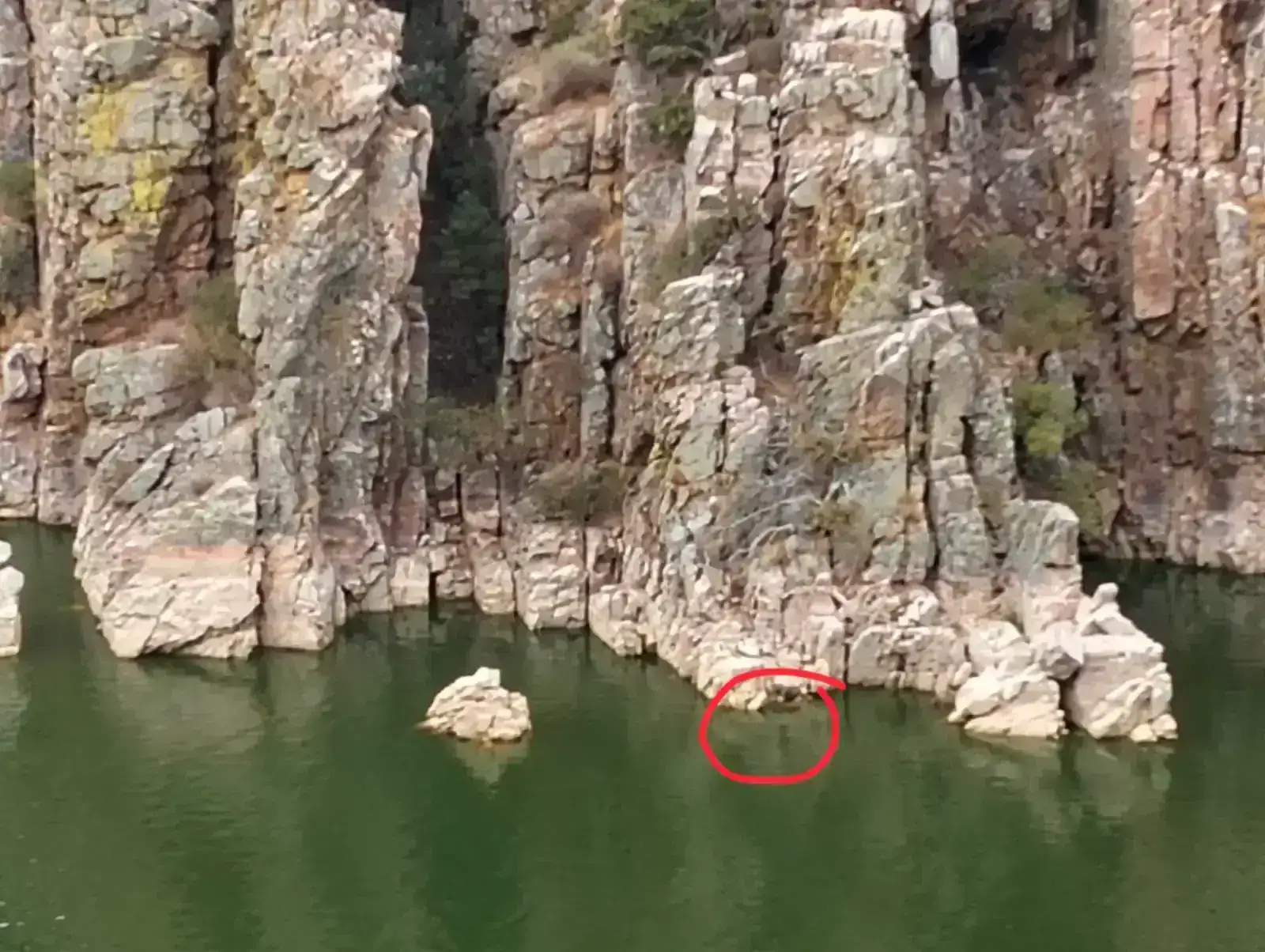 Mirador del Salto del gitano, en el círculo rojo hay un buitre que ha caído al agua, no creo que haya sobrevivido, se le veía bien con los prismáticos.