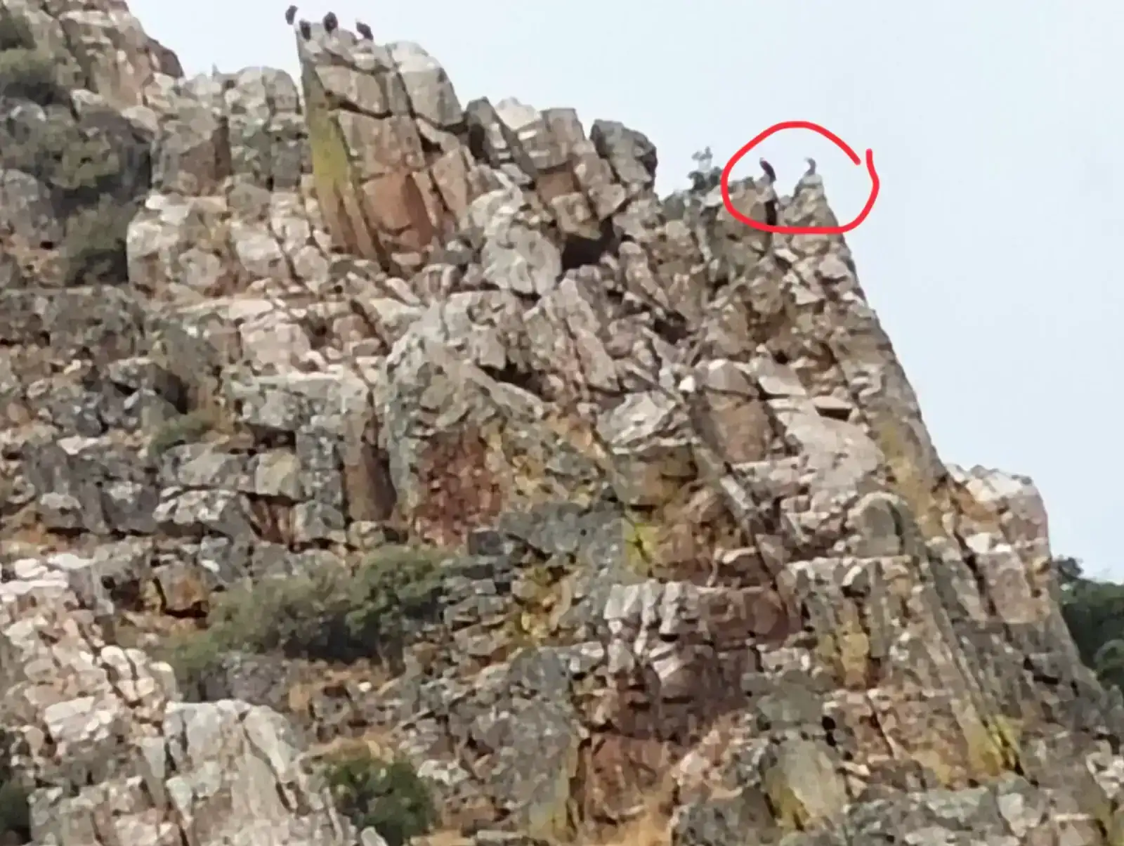 Aquí lo mismo, sin prismáticos no sé podían diferenciar, estaba lleno de buitres leonados y donde el círculo, el de la derecha es un alimoche y el de al lado un buitre negro.