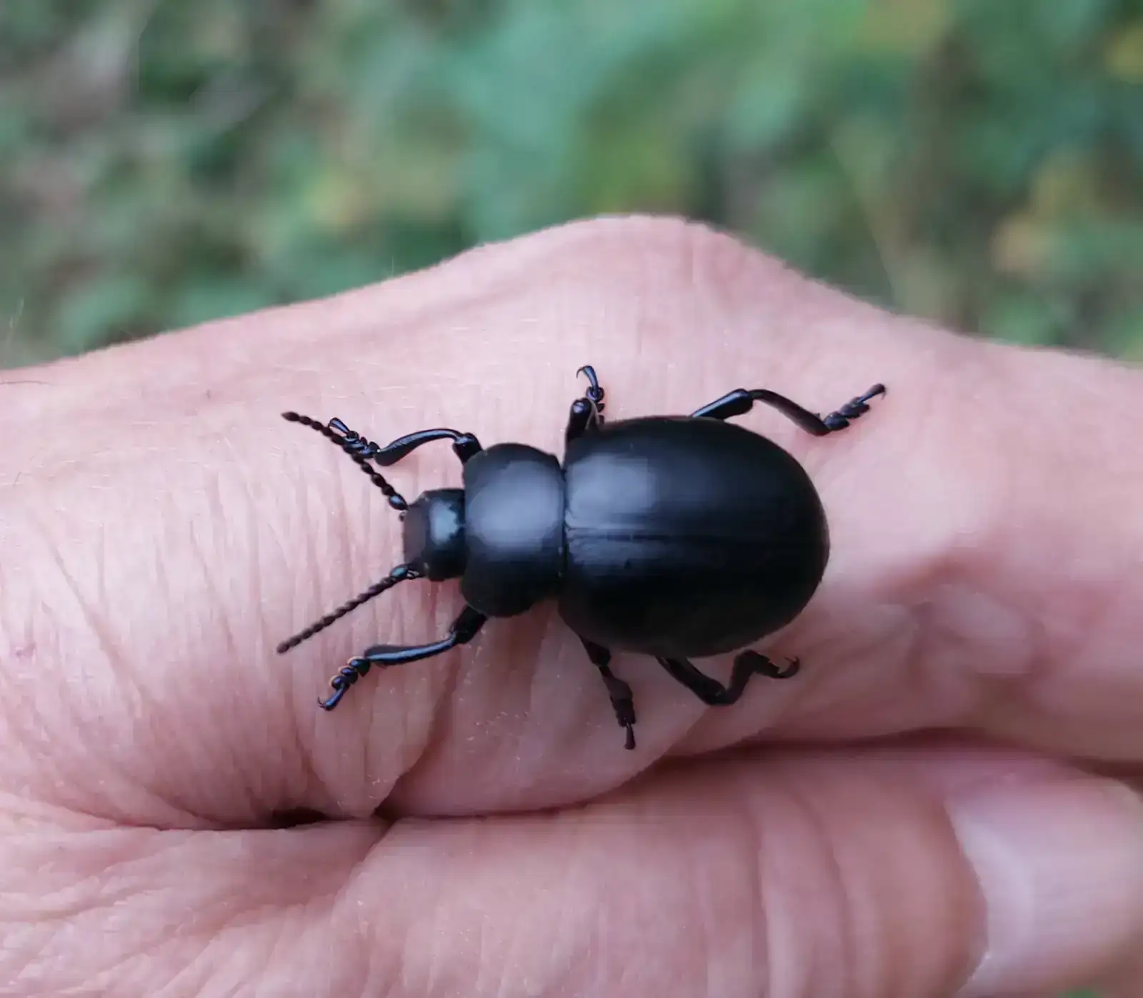 Cuerpo muy abovedado, incapaz de volar. No sé si tiene alas, porque los élitros los tiene pegados, y nunca los he forzado para abrirlos, tampoco me los he encontrado muertos.