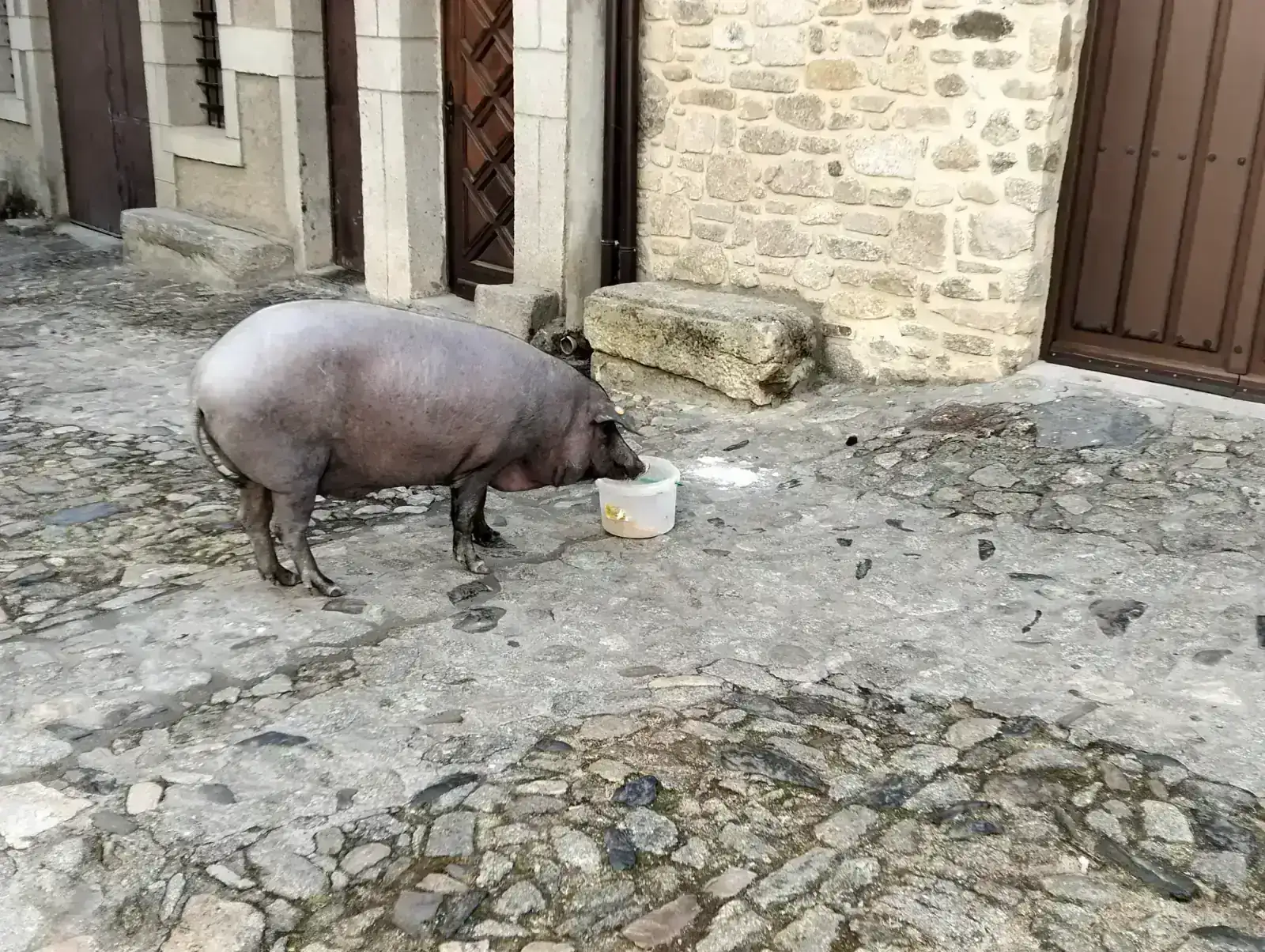 Cerdo ibérico en La Alberca, antiguamente lo soltaban por las calles y le daban de comer los vecinos, para luego dárselo a las familias más necesitadas, hoy en día se sortea mediante la compra de papeletas y lo que se saca va destinado a una ONG.
