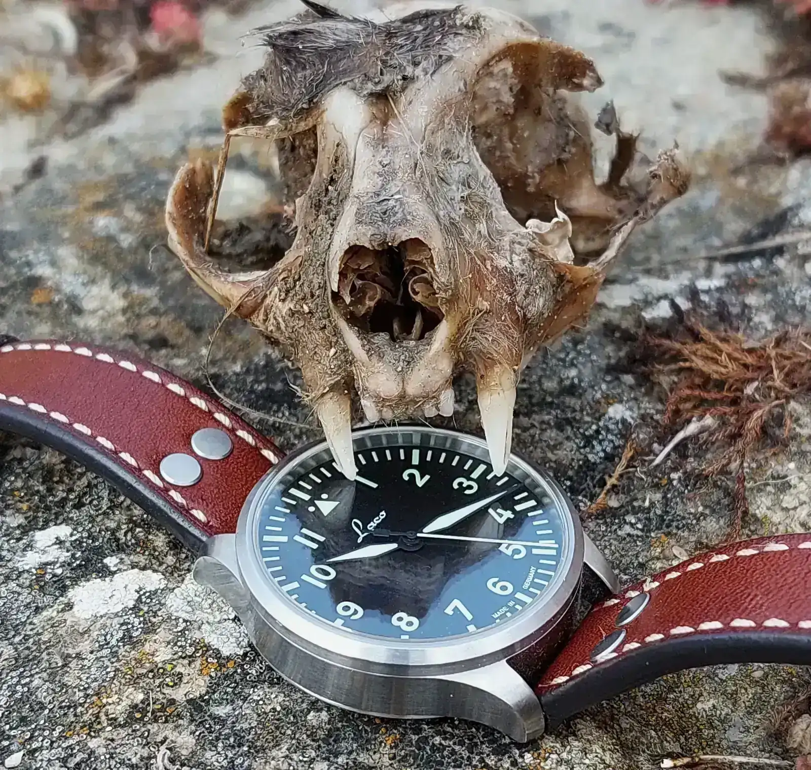 Esta foto está tomada hace ya unos meses, me encuentro en pleno monte con el cráneo superior de un carnívoro, en las inmediaciones no consigo encontrar ningún otro resto del esqueleto.