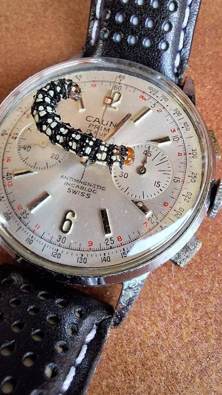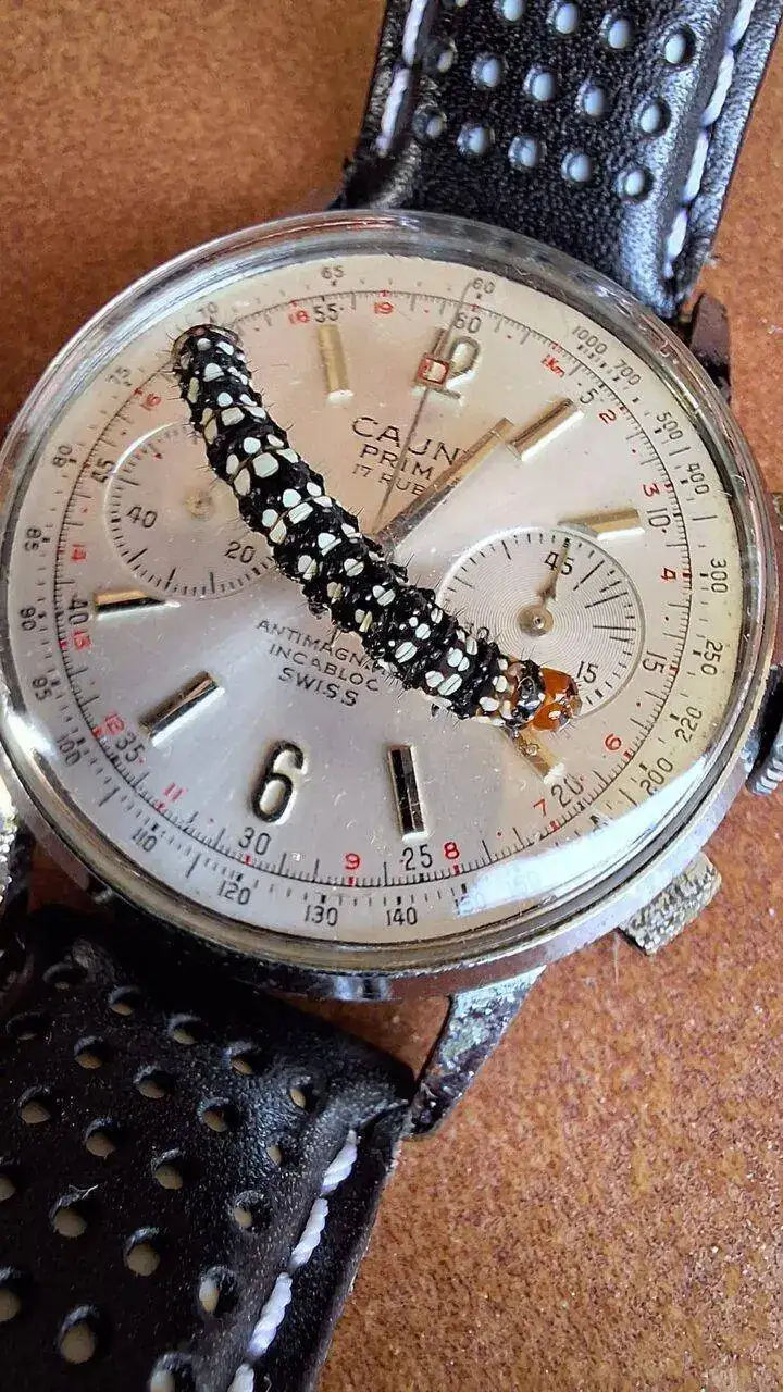 Eres un máquina!!!Precioso reloj. Y qué oruga más curiosa, parece que tiene dos cabezas, una adelante y otra detrás. Creo que es una oruga de Brithys crini, y si es así la debes haber encontrado no muy lejos del mar. Al parecer la llaman polilla del lirio. Ésta no la he visto nunca en vivo.