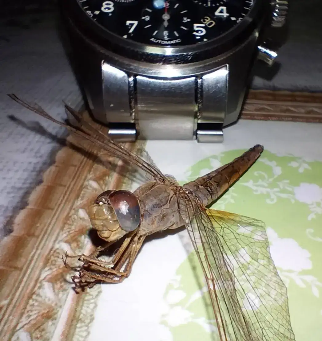 Seguramente la encontró moribunda en la calle. Los ejemplares adultos no suelen sobrevivir al mes de noviembre, y por su aspecto la veo totalmente desgastada, las alas las tiene casi transparentes por falta de escamas, y el tórax ha perdido casi toda la cobertura superior. Seguramente habrá hecho su puesta de huevos y cumplido su ciclo en la vida. Al parecer suelen venir como visitantes desde el norte de África, y son muy raras de ver en el norte de la península