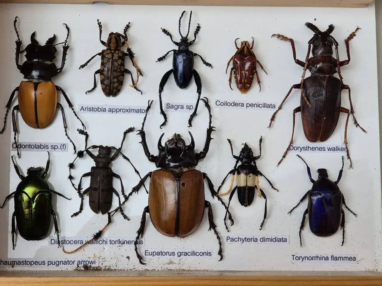 ¿Has probado con pequeños trozos de naftalina dentro de la colección?.Esta caja es la que está en proceso de desinsectación. El polvillo inferior y un par de "camisas" vacías, corresponden al parásito. Se ha estado alimentando del Eupatorus.