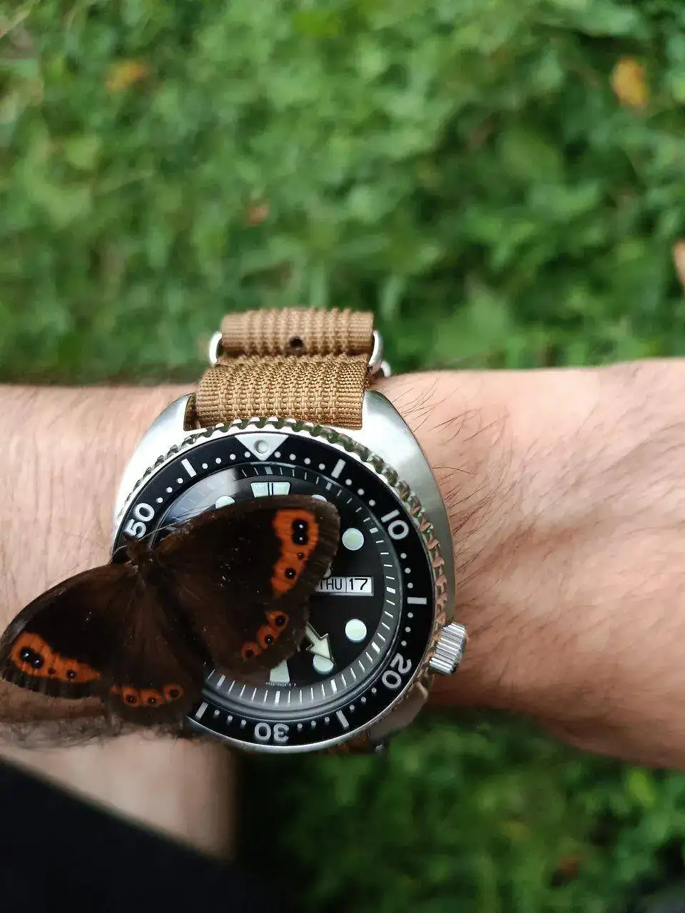 Pongo una reciente que tengo a mano, para empezar. Hace una semana, arrán marrón (Erebia ligea) y Seiko tortuga antracita.