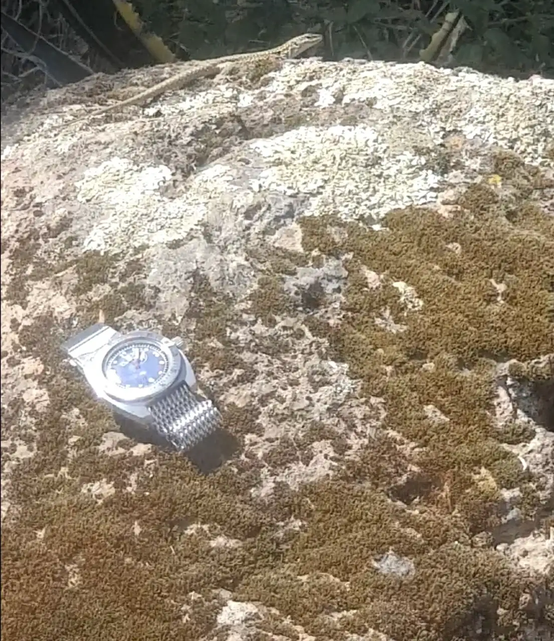 Y una más, donde se puede ver casi decentemente una lagartija y el reloj ruso que me ha acompañado en vacaciones.