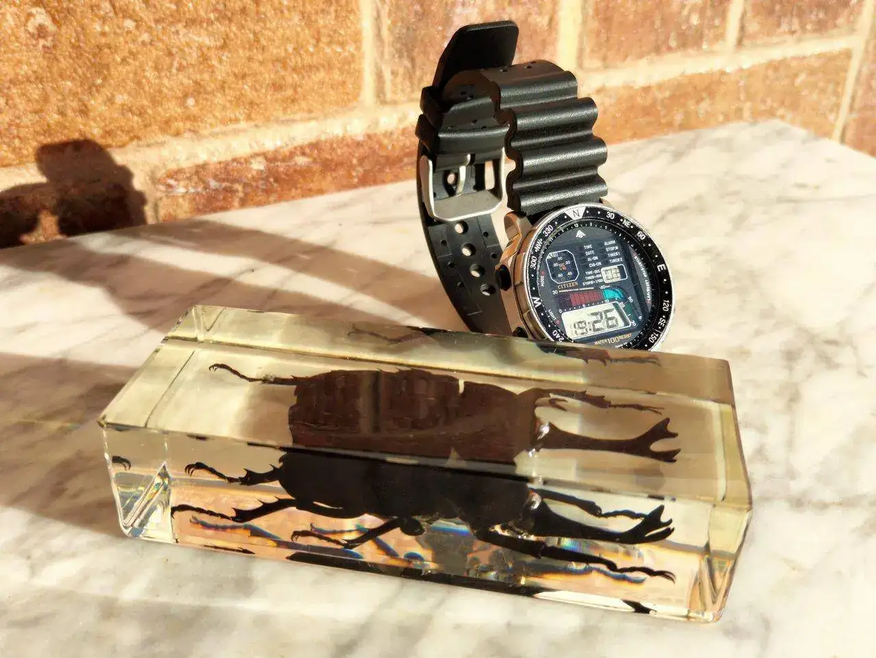 Un Citizen ochentero, y un escarabajo rinoceronte japonés en metacrilato, de esos de colección. Sólo suelo comprar el primer fascículo.