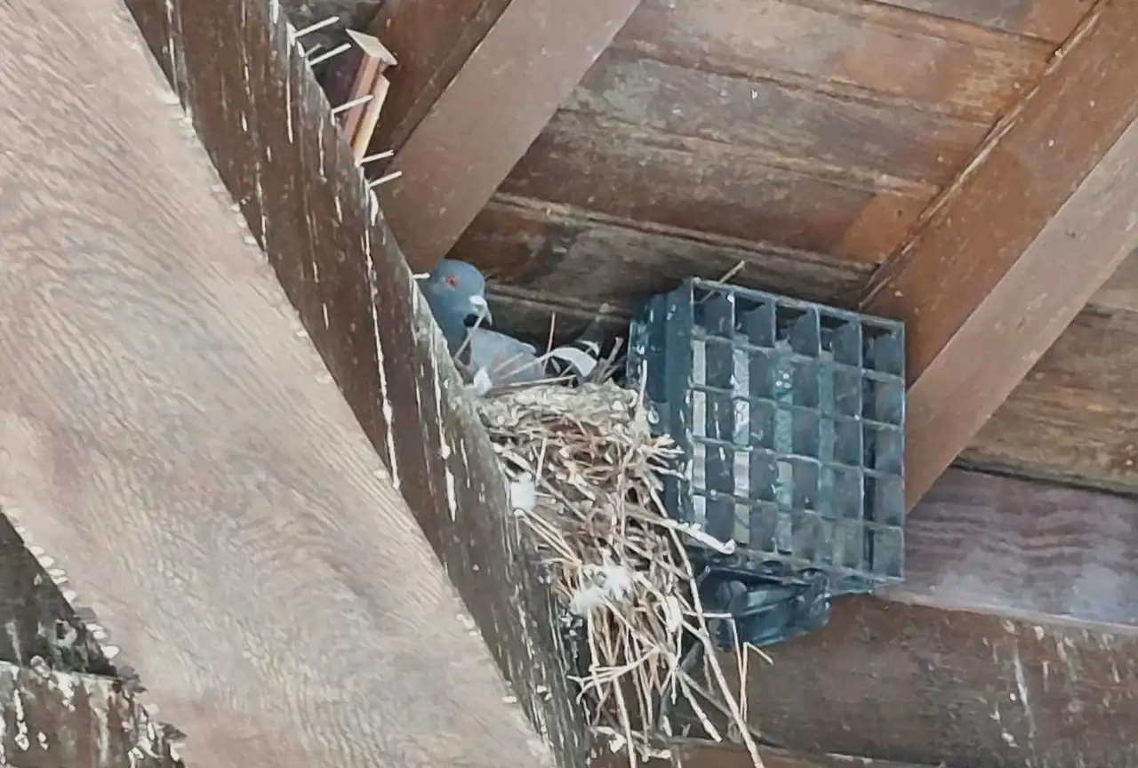 Les encantan los sitios así para anidar, bajo techumbres acogedoras.Palomas anidando en grupo en el soportal de una ermita.