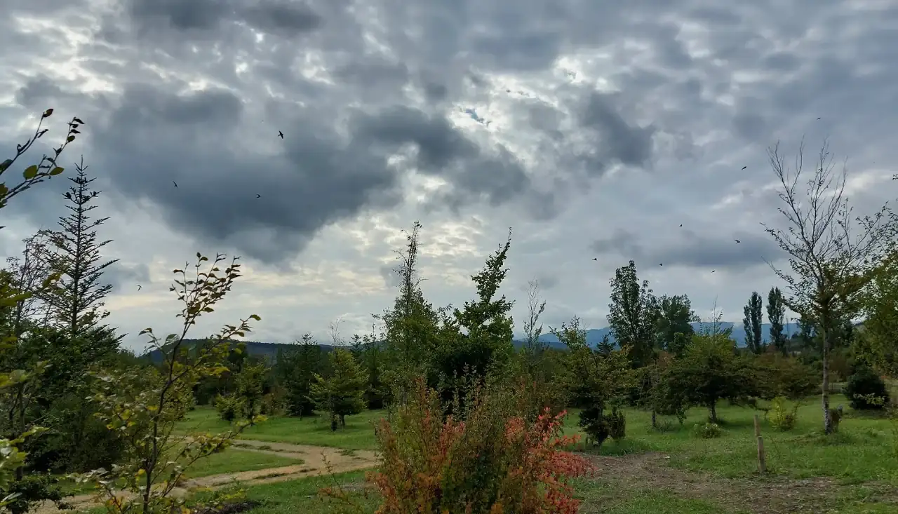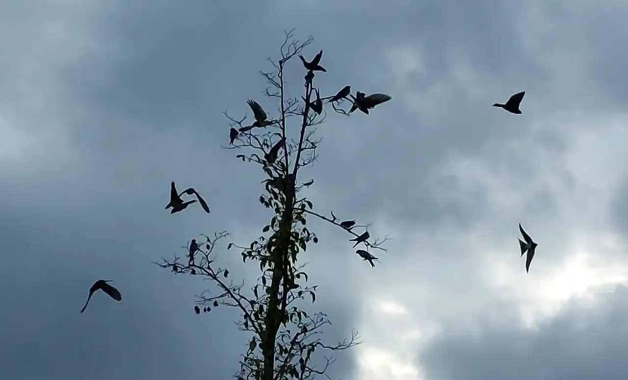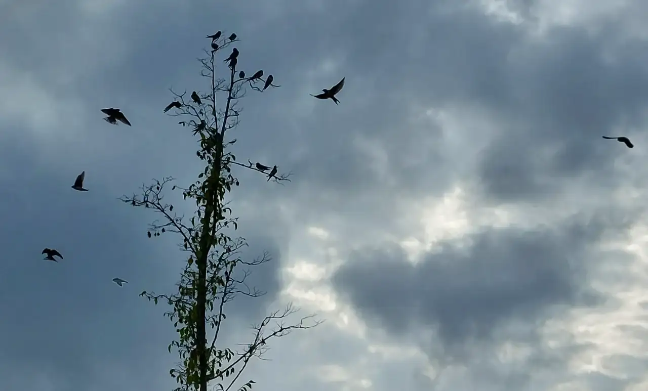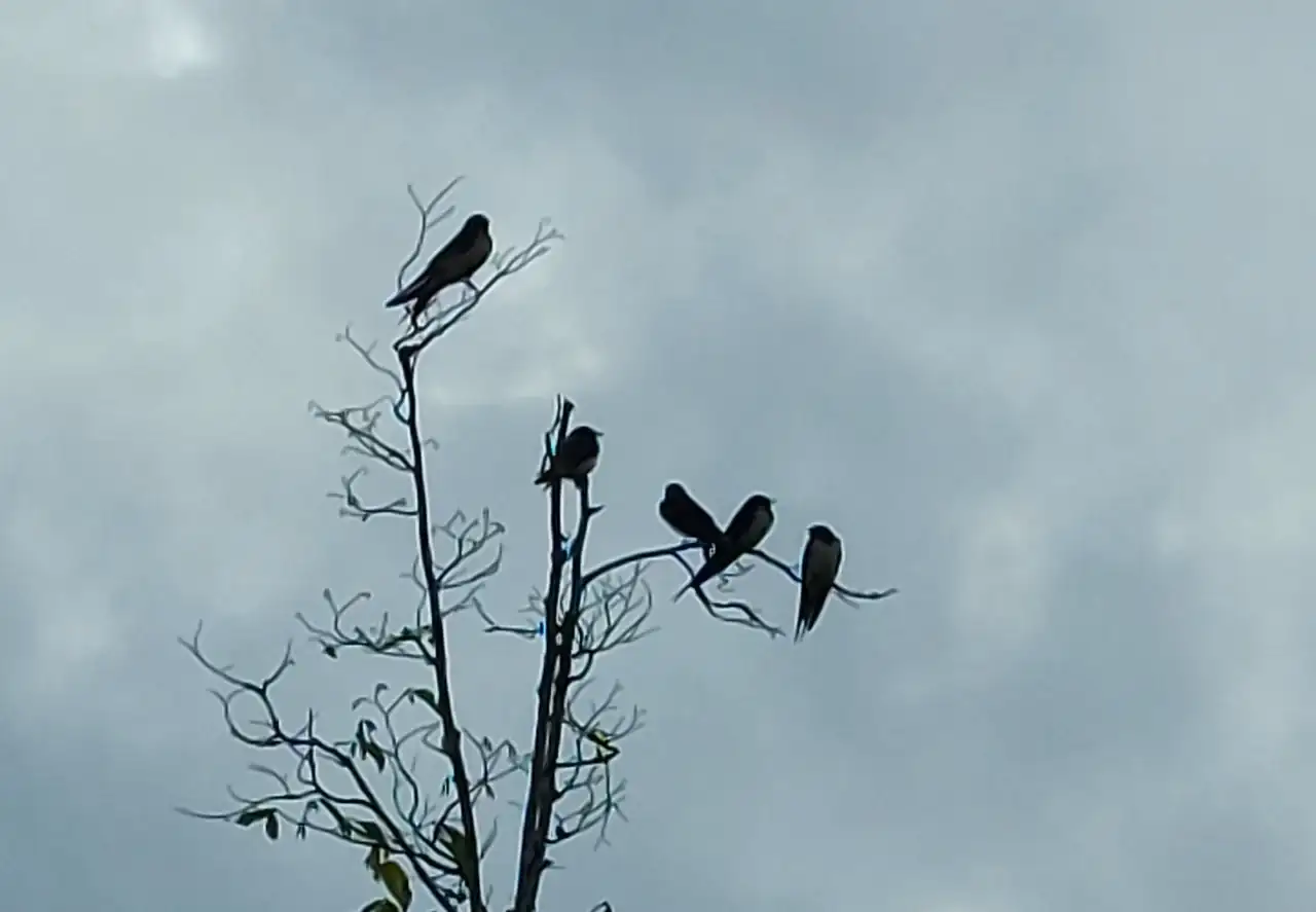 Un grupo bastante numeroso de golondrinas posadas entre unos árboles, estas aves hace ya bastante tiempo que nos han abandonado por este año, luego bien han parado a descansar en su viaje migratorio hacia otras latitudes o la amenaza de tormenta ese día en su trayecto les ha obligado a bajar a tierra.