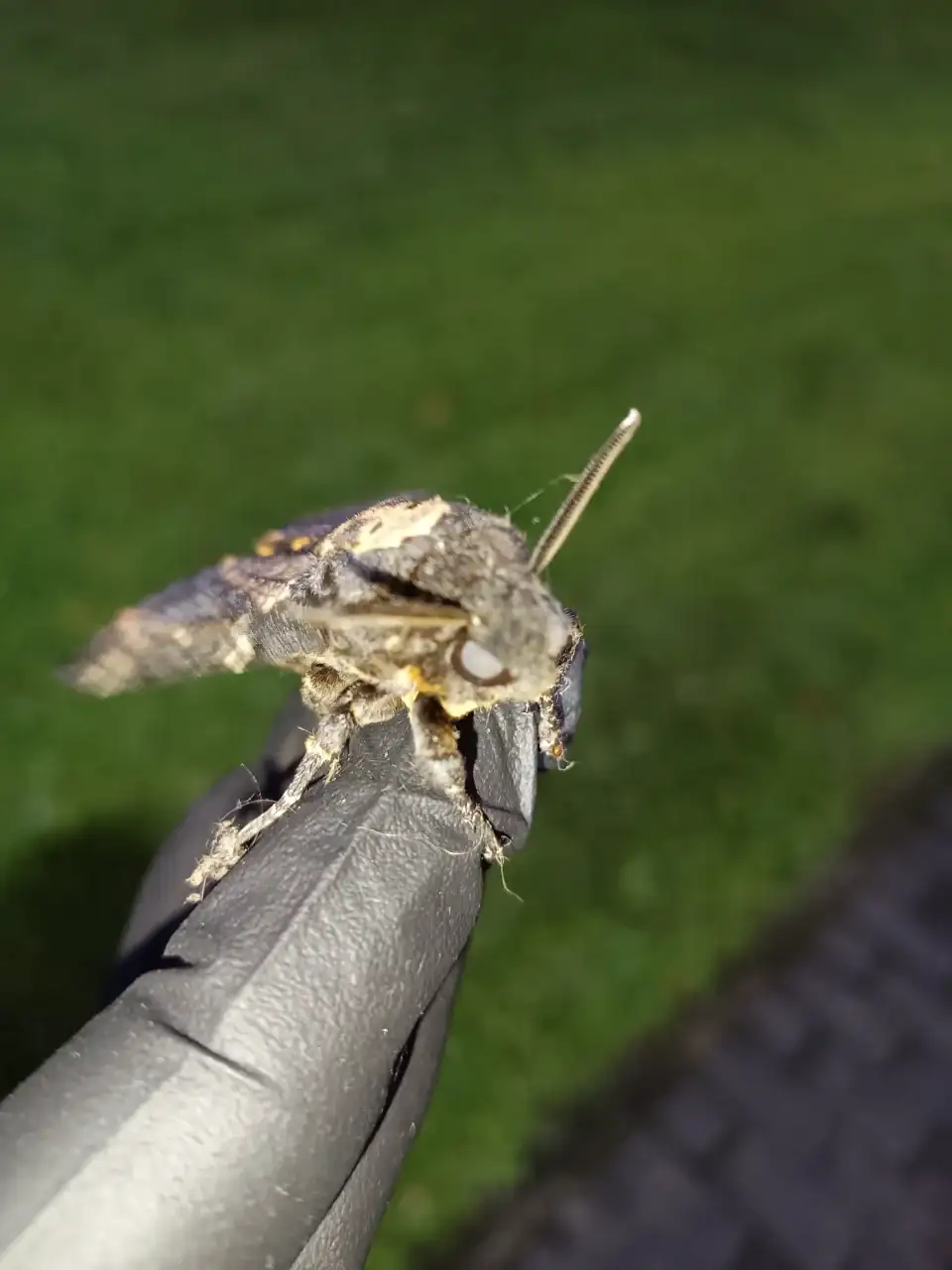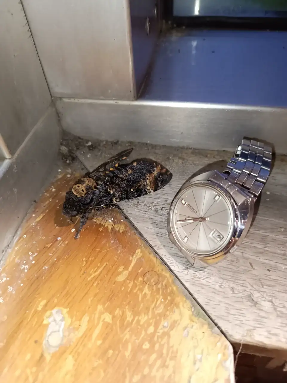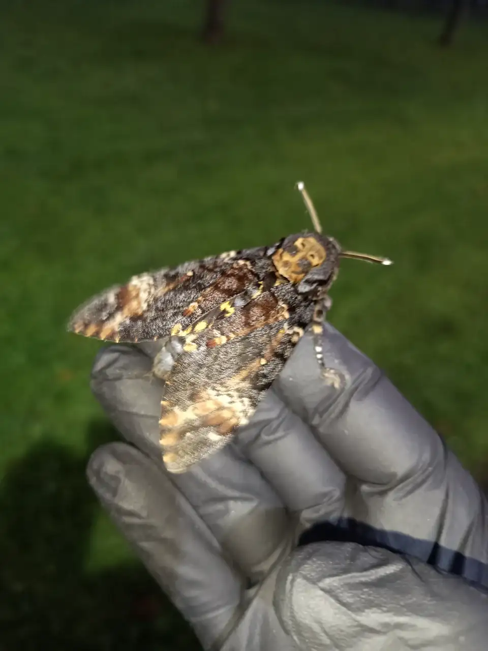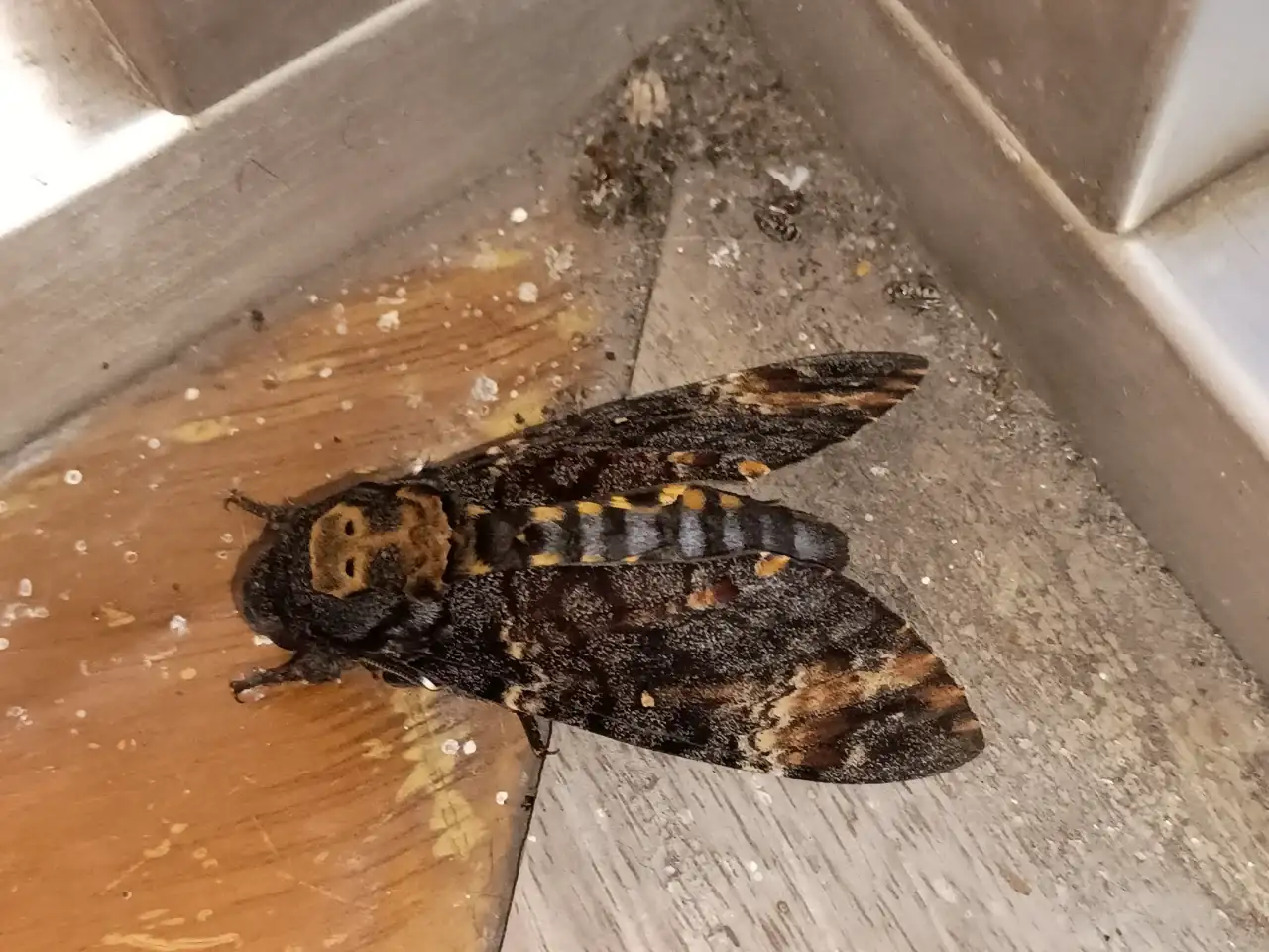 Buenos días! Mirad lo que me encontré esta mañana, creo que es una Acherontya Styx, creo que era la que salía en el cartel de la película El silencio de los corderos.