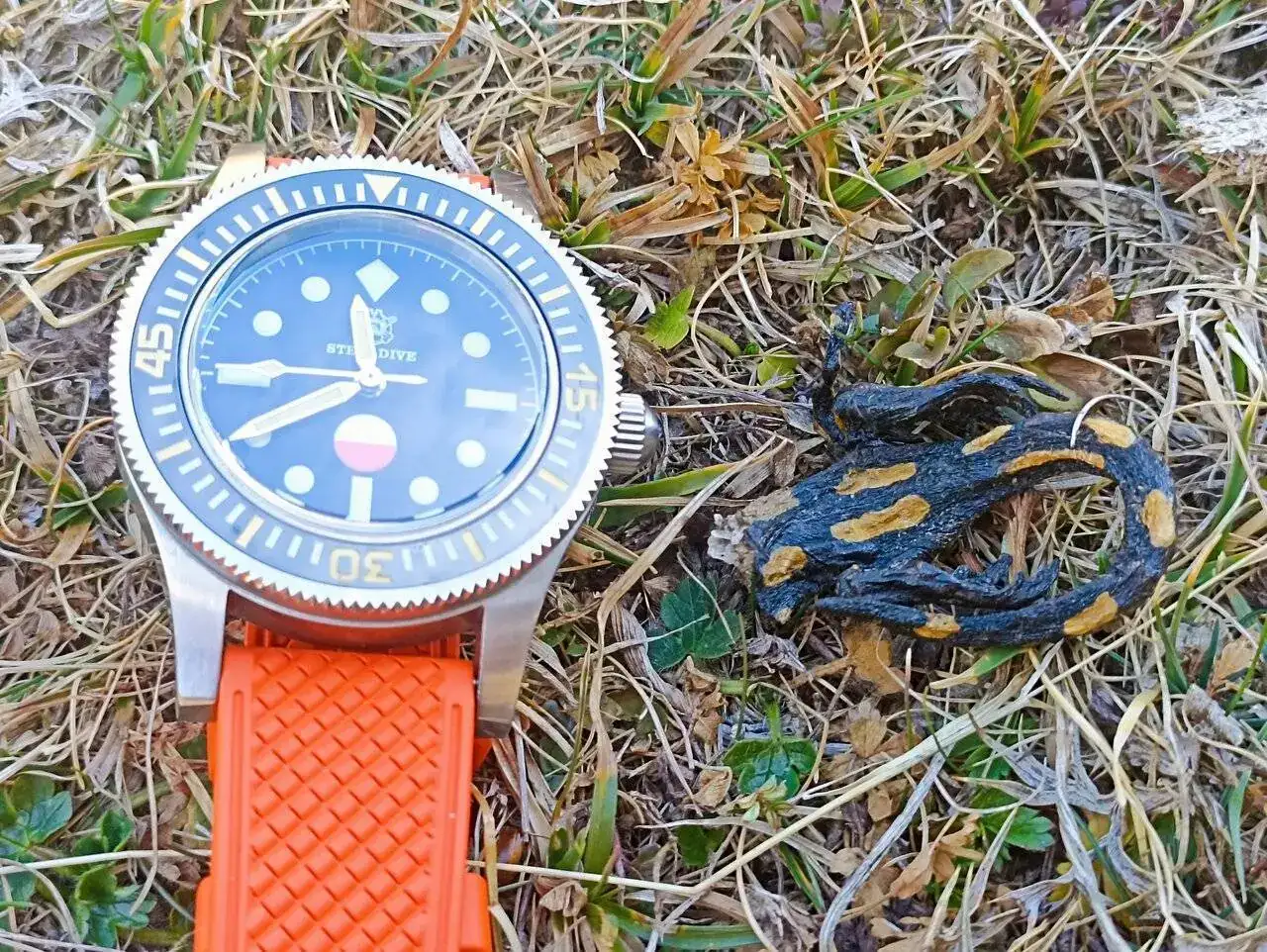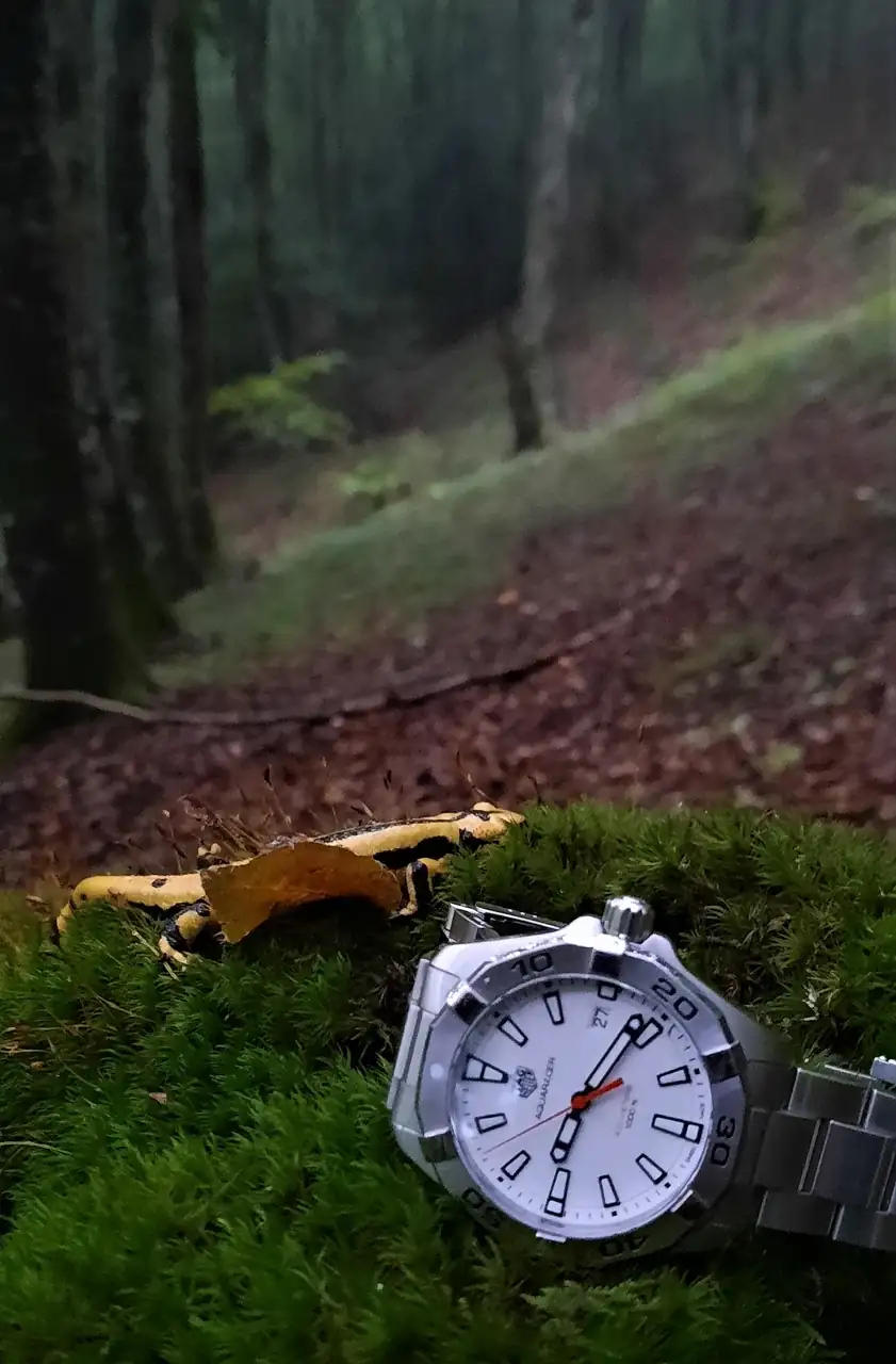 Hoy en la excursión nos hemos topado con una Salamandra salamandra o salamandra común. O mejor dicho, lo que quedaba de ella... Aunque sus colores seguían destacando en el paisaje tanto como mi correa de caucho. Me pregunto cuál sería la historia aquí, un trabajo para el CSI del bosque.