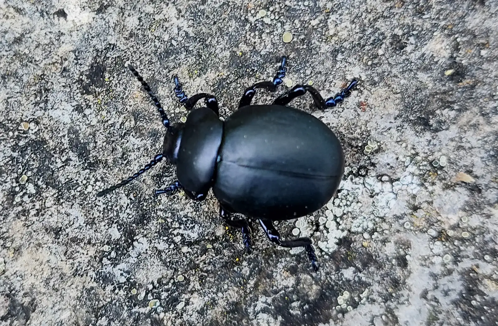 Cuerpo muy abovedado, incapaz de volar. No sé si tiene alas, porque los élitros los tiene pegados, y nunca los he forzado para abrirlos, tampoco me los he encontrado muertos.