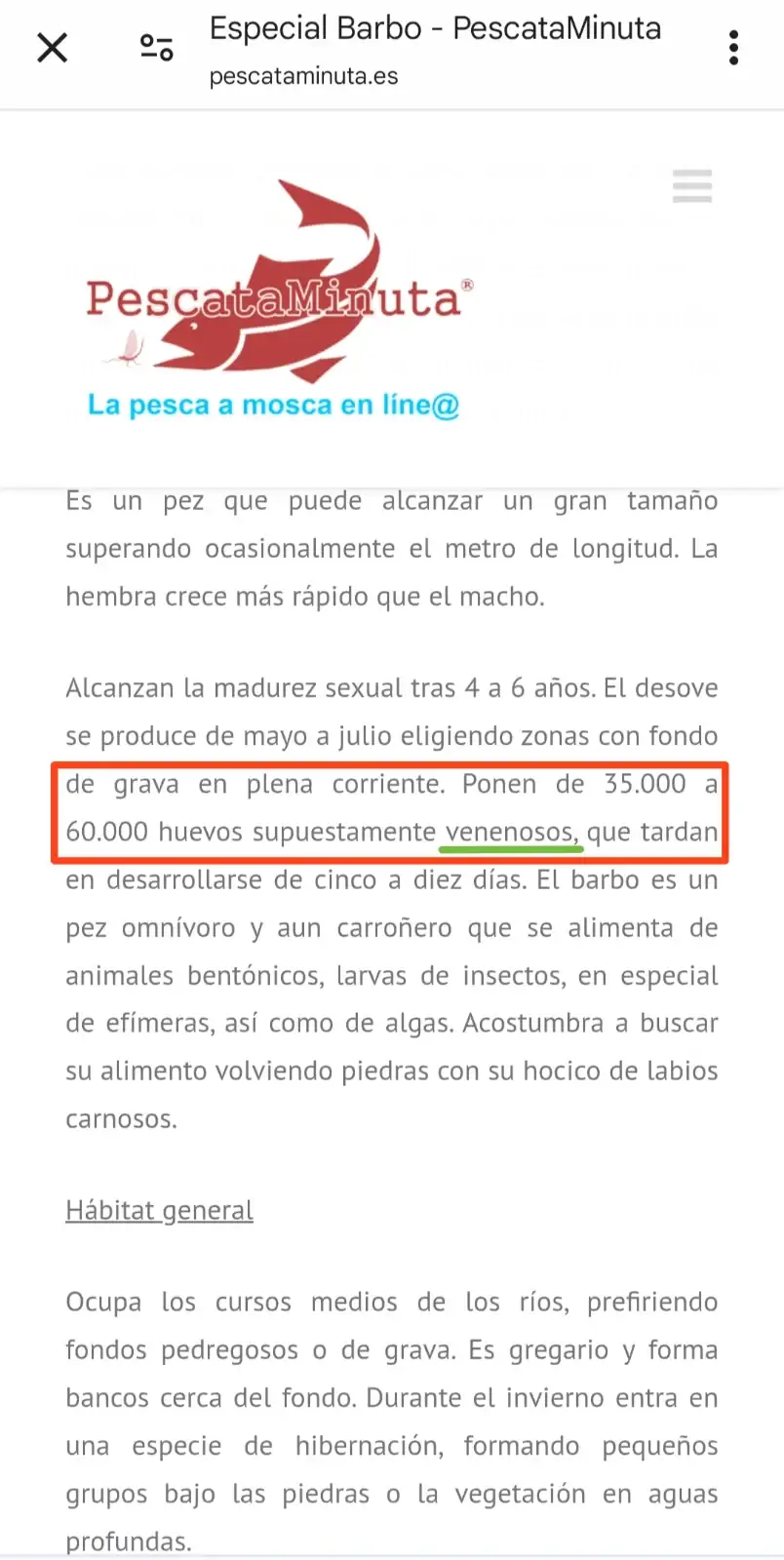 En mi entorno no hay cultura sobre el barbo a la hora de consumirlo, por lo que nunca había oído sobre la toxicidad de sus huevas. No he encontrado información al respecto más allá de que si vas a consumir una hembra que has pescado, la limpies de huevas si las tiene.