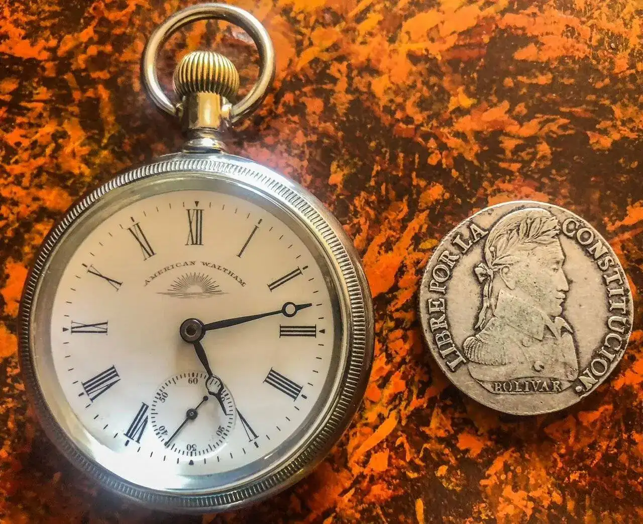 Tenemos un reloj de plata Waltham con una moneda de 8 soles de plata