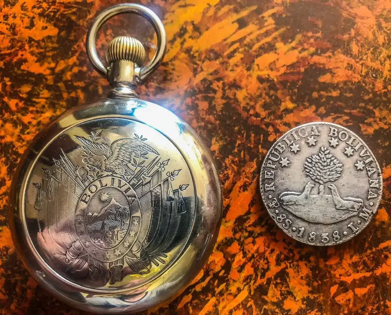Tenemos un reloj de calibre francés con grabado del escudo de Bolivia junto con una de las primeras monedas acuñadas en la Ceca Potosí con la efigie del Libertador Simón Bolivar (de quien toma nombre mi país)