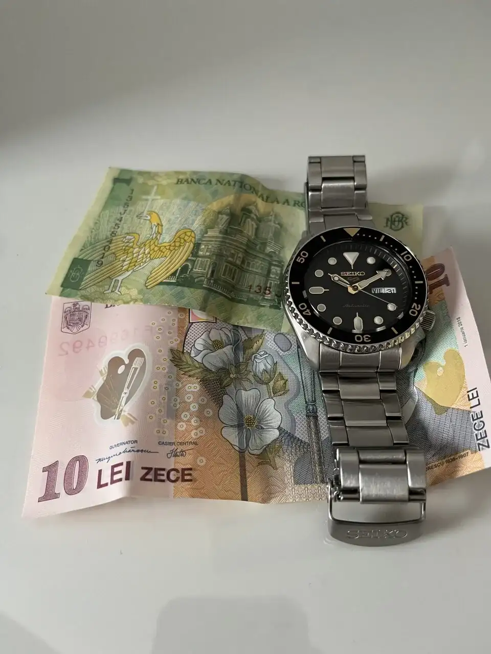 Estuve en Rumanía en una boda hace un par de años, también descubrí el tacto de esos billetes allí.Lei; moneda de Rumania la cual visite el mes pasado, y mi seiko 5 que utilize para este viaje.