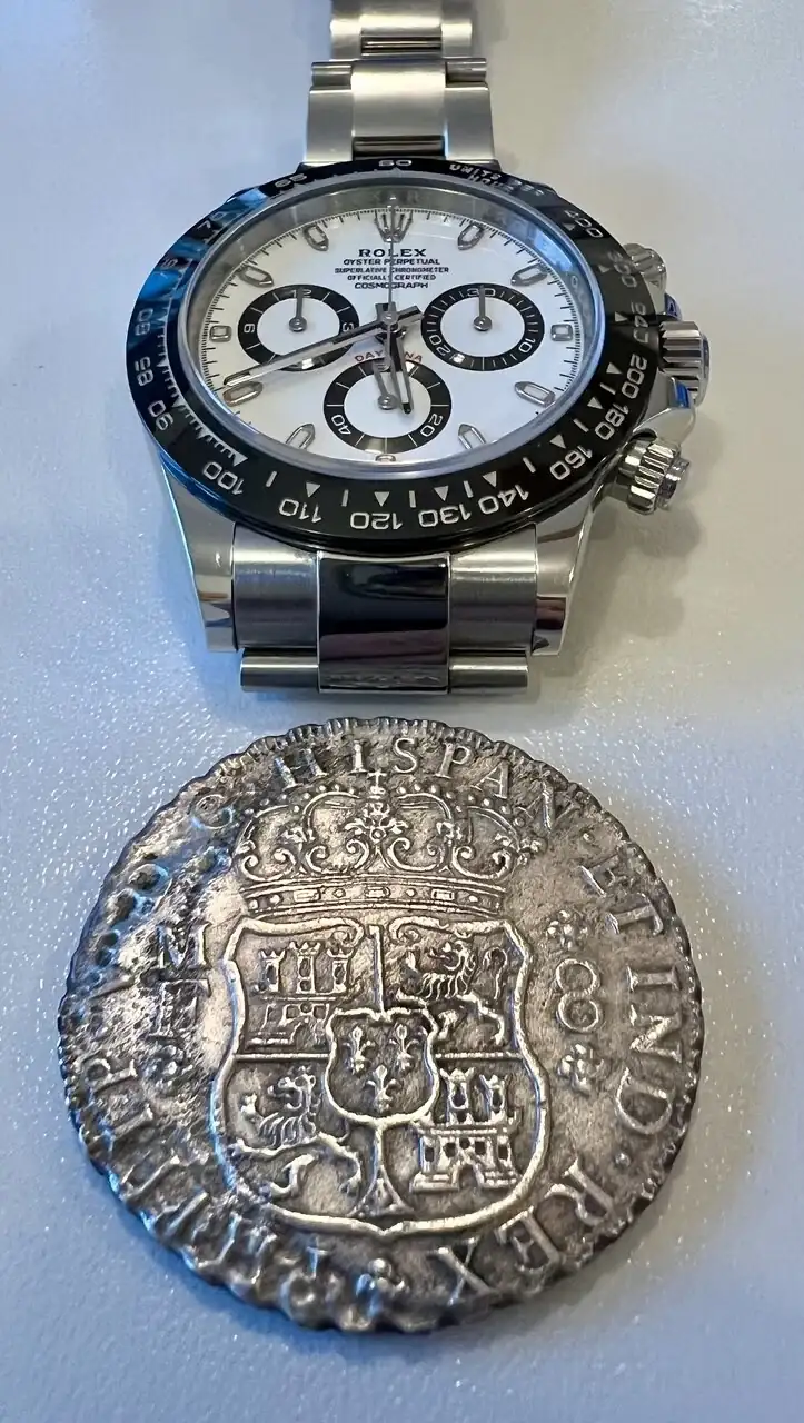 Y me ha comentado que le ha llamado la atención ésta. Esas rugosidades en los bordes al parecer son por el agua de mar. Pudiera ser una moneda de un naufragio.