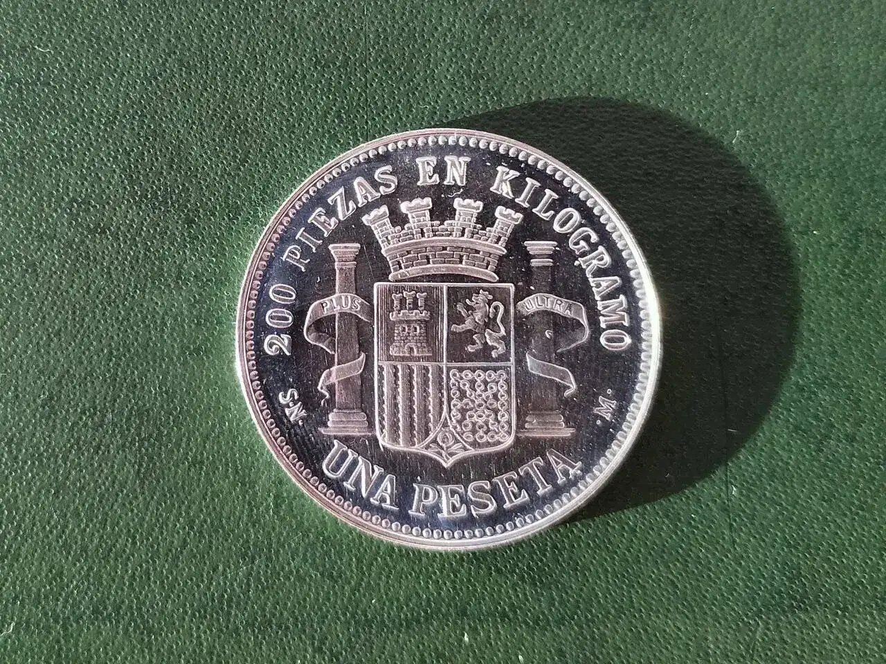 Según la descripción que venía con la moneda, la figura que sostiene la rama de olivo representa a España con la Corona Mural, está recostada sobre los Pirineos y lo que se ve al fondo es el Peñón de Gibraltar.