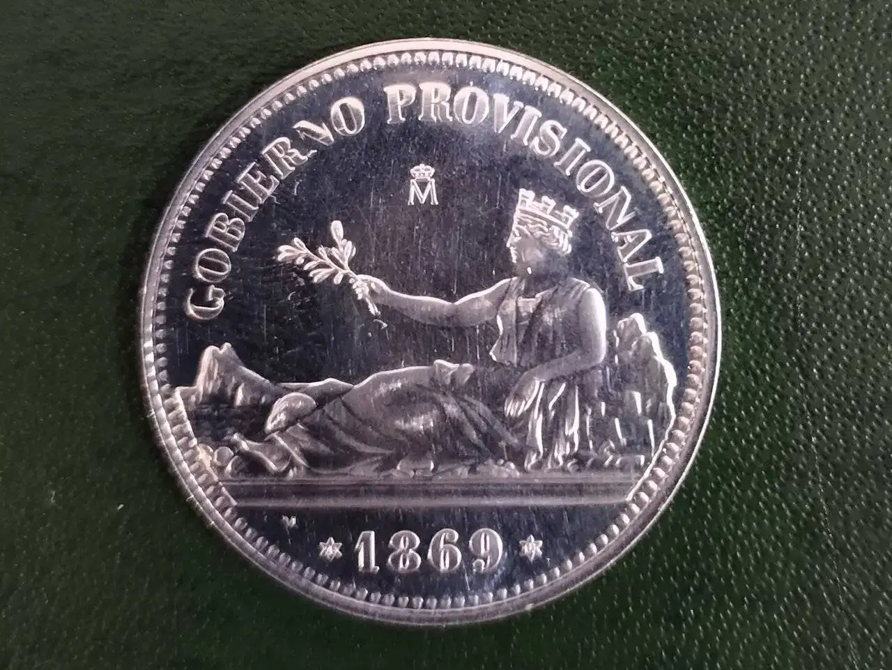 Reproducción en plata de una peseta de 1869, emitida durante el Gobierno Provisional de 1868 a 1871.