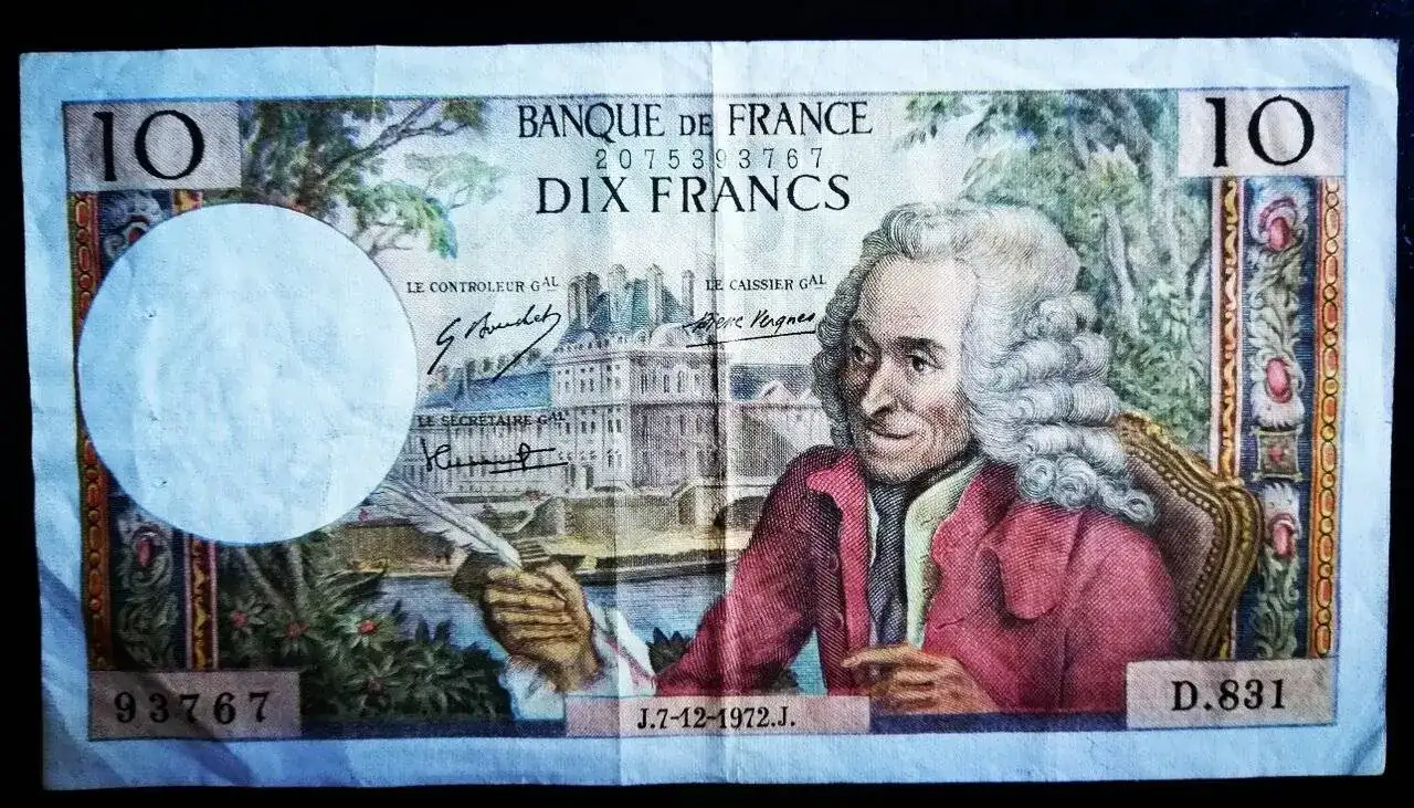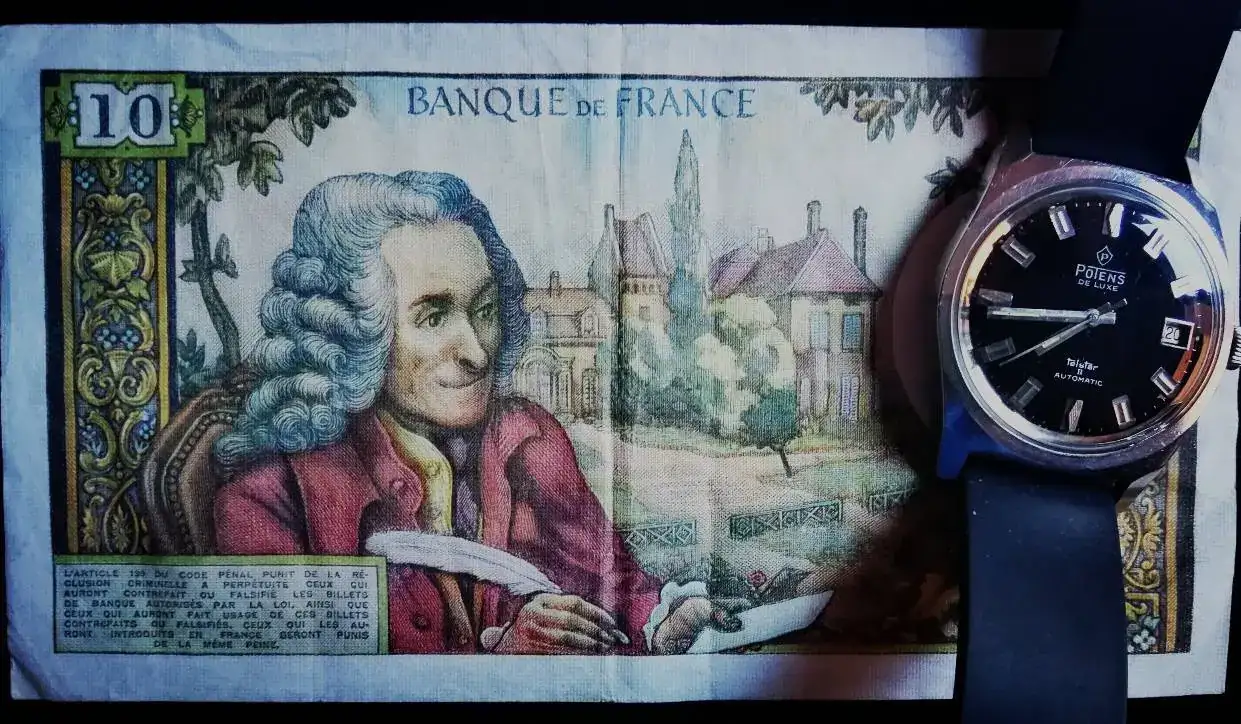 Vaya preciosidad de billete.10 francos franceses de 1972, con reloj Potens automático.
